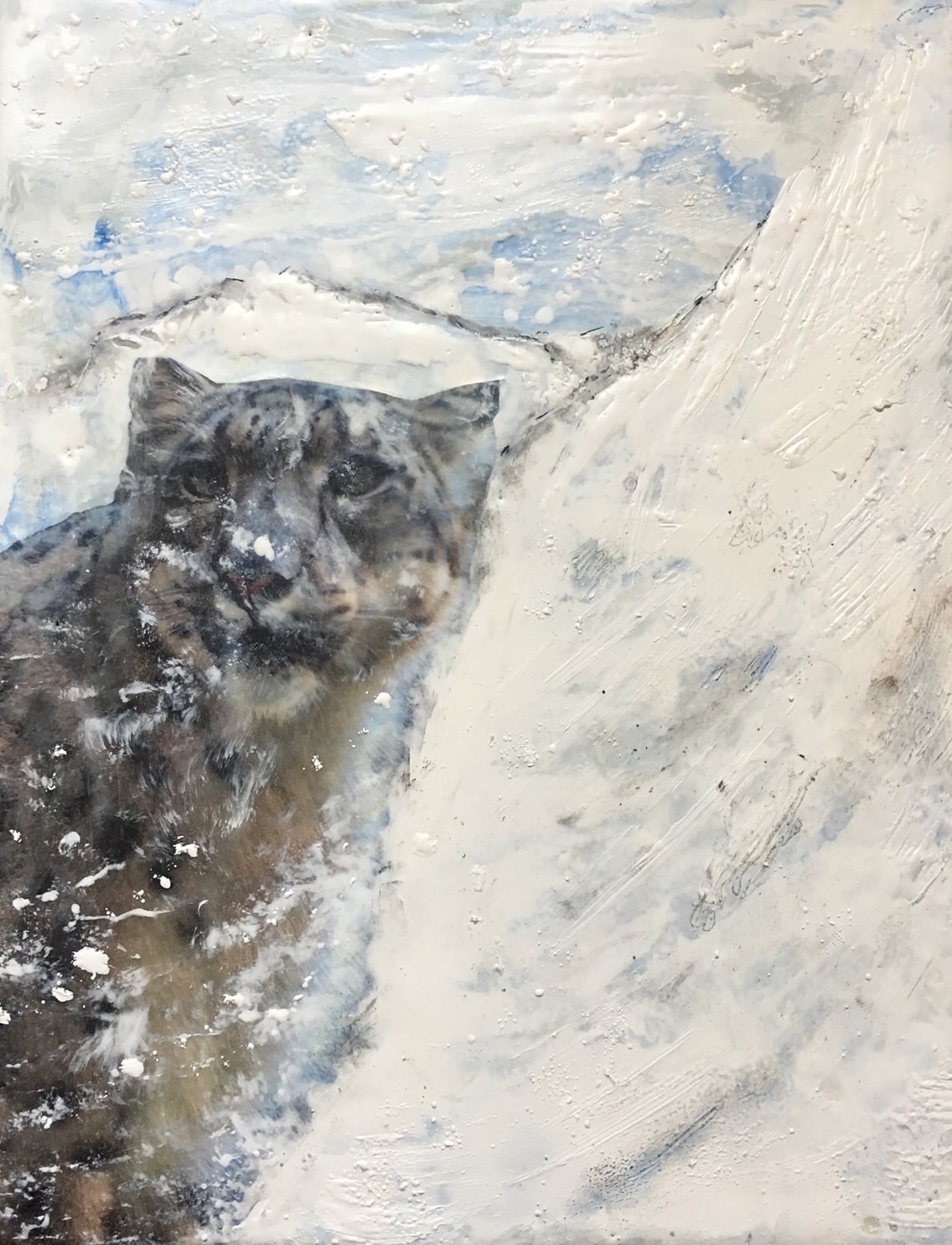 Addition of my photograph of Sarani, the female snow leopard at Brookfield Zoo, to an encaustic painting.