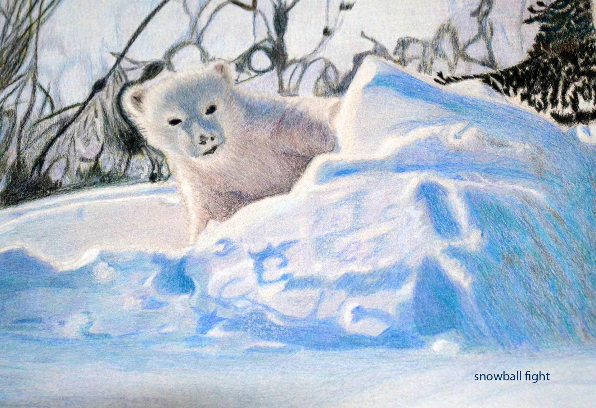 An early colored pencil piece. The bear behind the snow wall reminds me of snowball fights we used to have when I was younger.