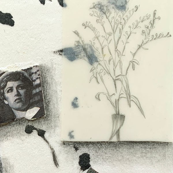 Backstory: The dark half of the year began. A grey day inspired me to combines a few squares from the Boulder Museum of Contemporary Art postcard invitation to “Portraits; Pets and People” from 1996. I saved several of these postcards that had 63 square portraits in a grid to use in collages. It was a special place for me, I used to exhibit there when it was the Boulder Art Gallery. Part of an acrylic end of day painting teamed up with a sort of Dalmatian painting that seemed to reflect the pet theme. Then superimposed a tiny remnant from DaVinci’s notebook and a small drawing of weeds that seem to be distressing the protagonist.