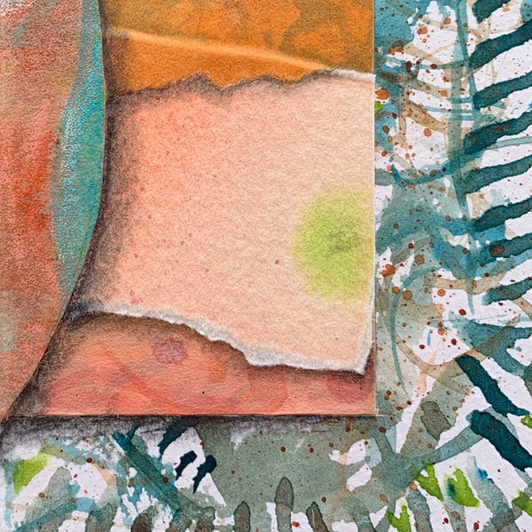 Read more: https://kathleen-obrien.com/backstories/ Backstory: I must have written “Always Merry and Bright” (from Henry Miller) a thousand times, here is one line of it. I remember thinking of Jupiter when I painted the circle. Even though the Spanish Capellades Abaca is painted with burnt orange it is still translucent to the watery painting below. The last of the thinnest birch bark, the cardboard with the black stripes, which I never saw again after I made “Book of Light page 102” repeated patterns.