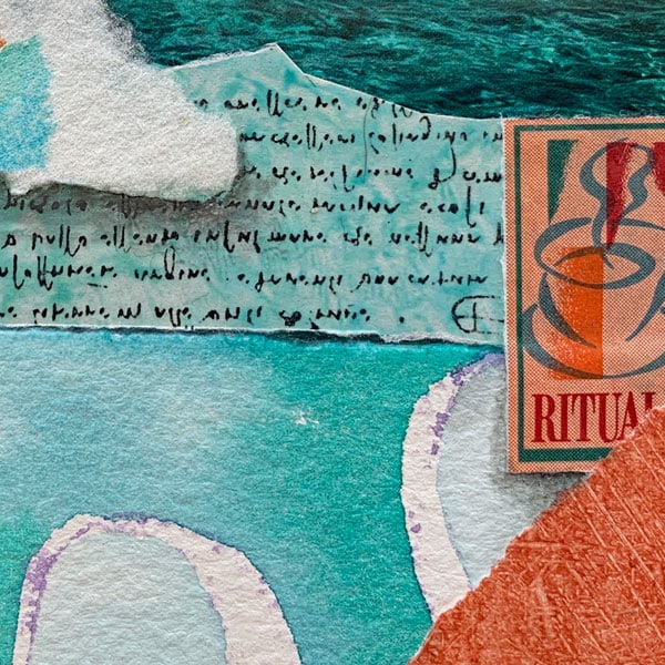 Read more: https://kathleen-obrien.com/backstories/ Backstory: Watercolor arches from 1978, DaVinci notebook, sugar packet from an airport coffee break, water symbols on Twinrocker Linen paper, paste paper used on a laminated frame for the “Book of Light” series. Ritual by the sea.