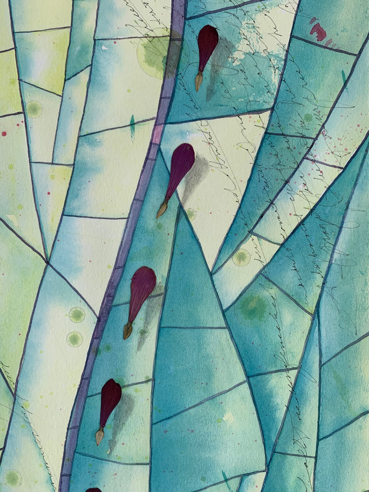 “Dragonfly” is a watercolor painting with graphite shadows and zinnia and larkspur petals collaged,on Rives BFK paper
