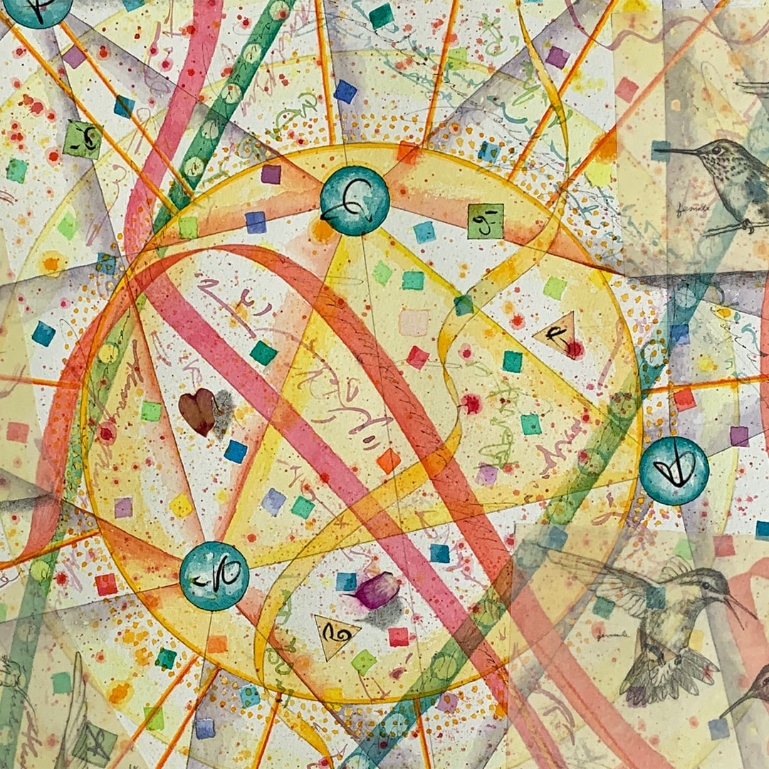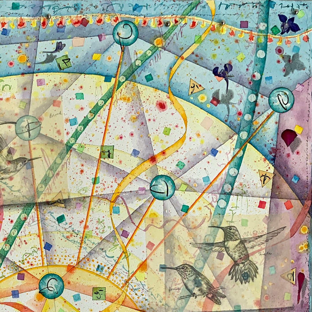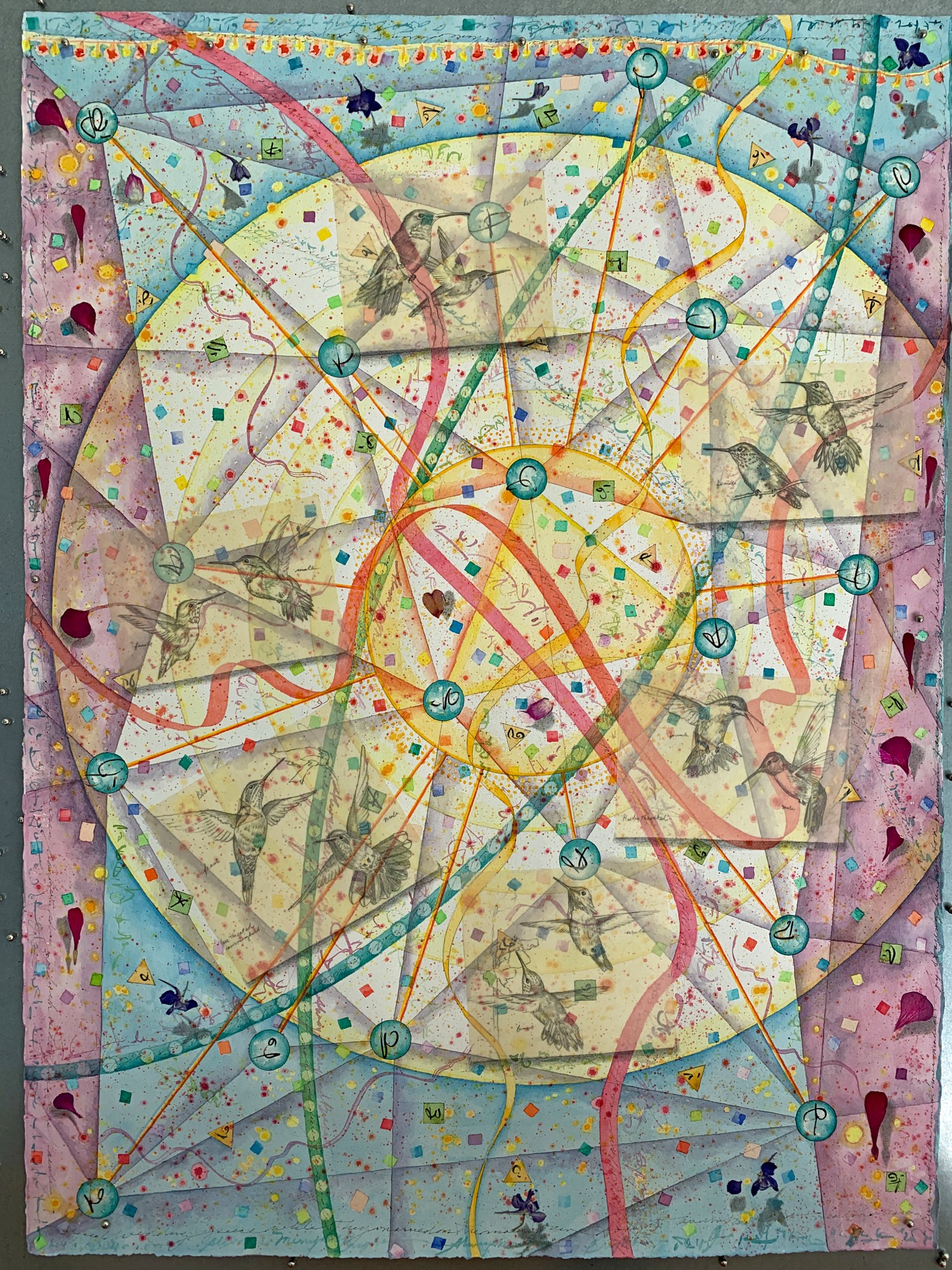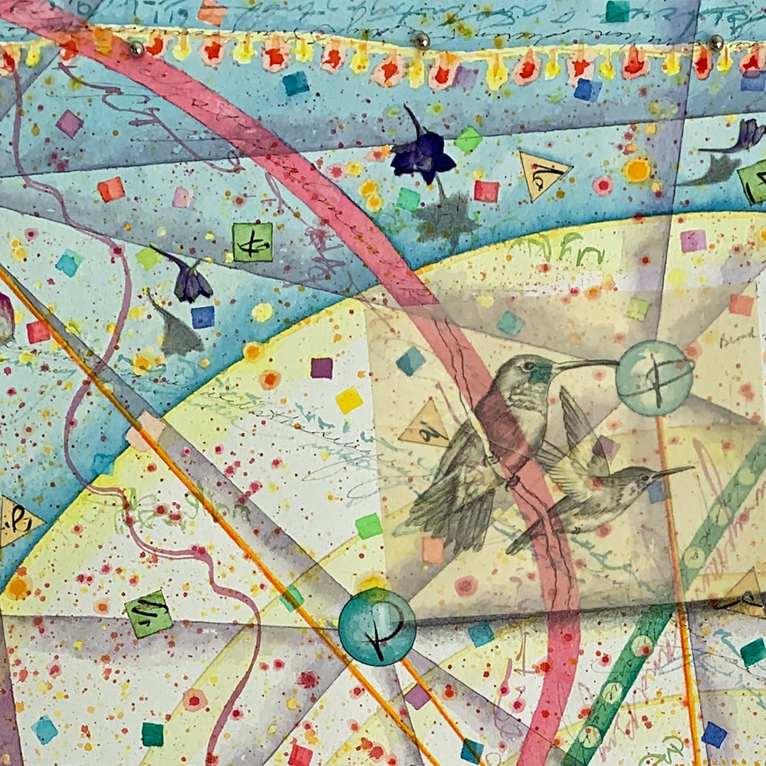 Hummingbird Sanctuary, Health and Help, the first in the series of hummingbirds, Hummingbird Sanctuary, Health and Help, features drawings of eight species collaged onto a 30×22” abstract watercolor.