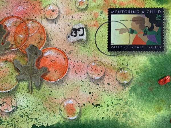 “Little Love Letter 06″ celebrates the joy of sharing the positive message of mentoring. Abstract watercolor, drawing, fig leaves and stamp