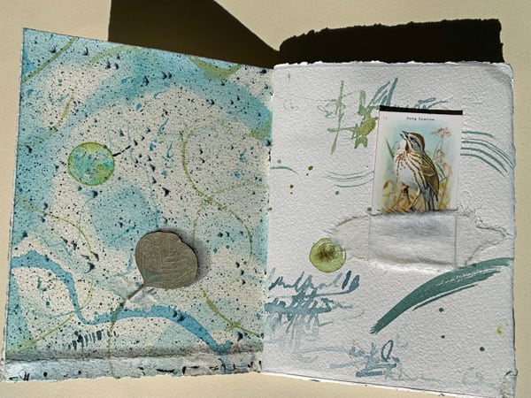 Songs from Little Landscapes is a 16 page artist book, with removable antique Arm and Hammer bird trading cards, and eucalyptus leaves on Arches Cover paper, woven binding