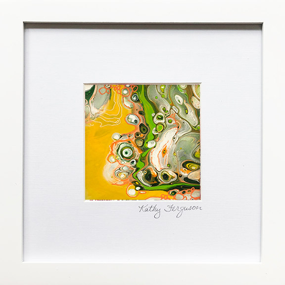 Alien Ooze is a small, framed and matted acrylic painting behind glass. I begin by selecting my paints taking into account the opacity, density, and color mixing properties of each color. I add floetrol (an additive that improves the flow and leveling of paint) and silicone. The big moment comes when I pour the liquid concoction onto Graphix film, tilting and tipping to get the look I want. I use a butane torch to get cells of color to bubble up to the surface.