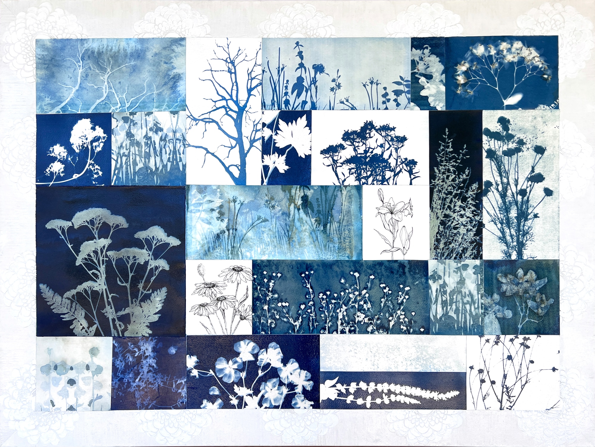 As summer transitions into fall, I’m seeing subtle environmental changes daily. This time of change spurred the idea to incorporate last fall’s and this summer’s cyanotype prints into two large grid paintings. These artworks allowed me to artistically showcase an impressive assortment of over 30 plant varieties sourced from my garden, hiking excursions, and sketches inspired by the flora in my neighbors’ yards.