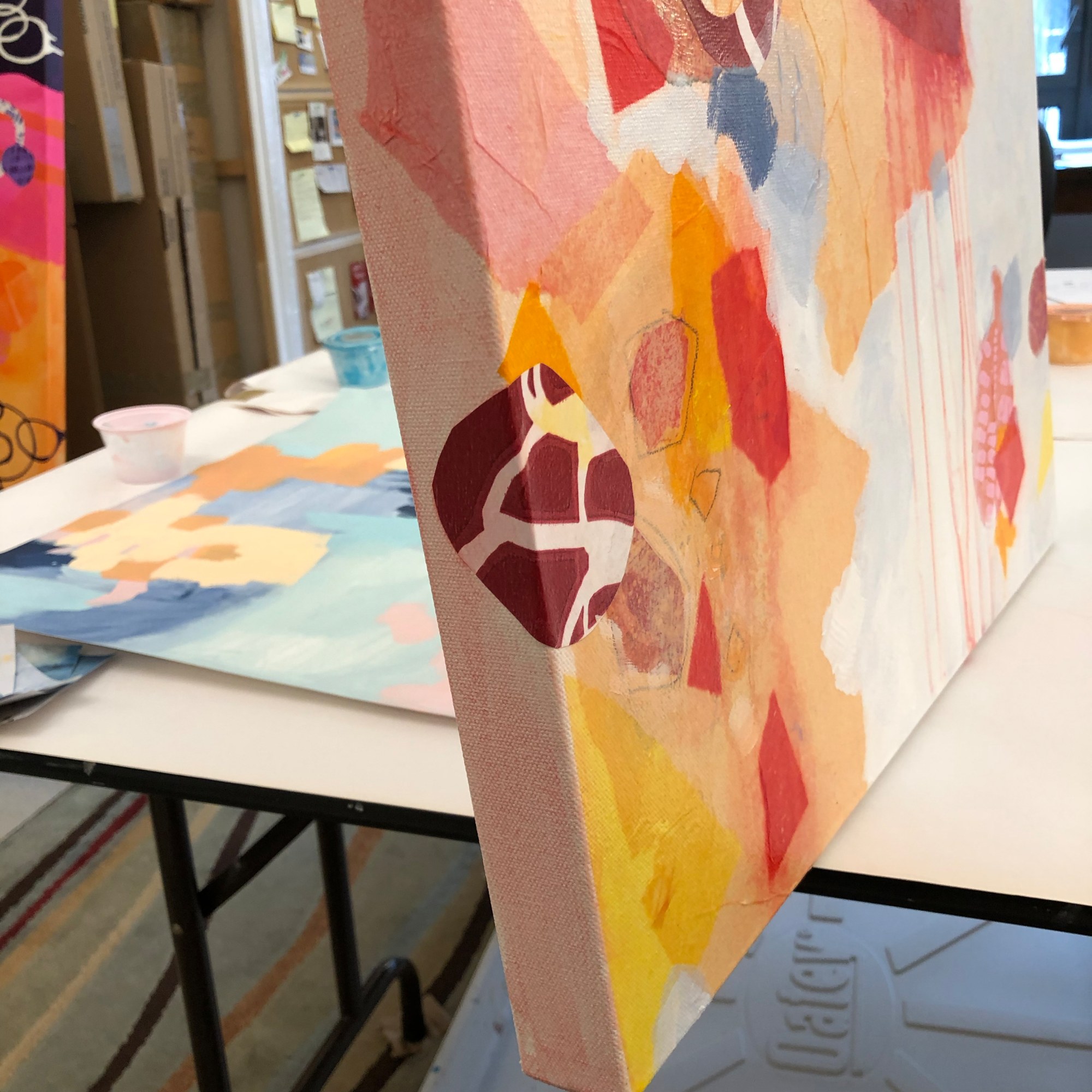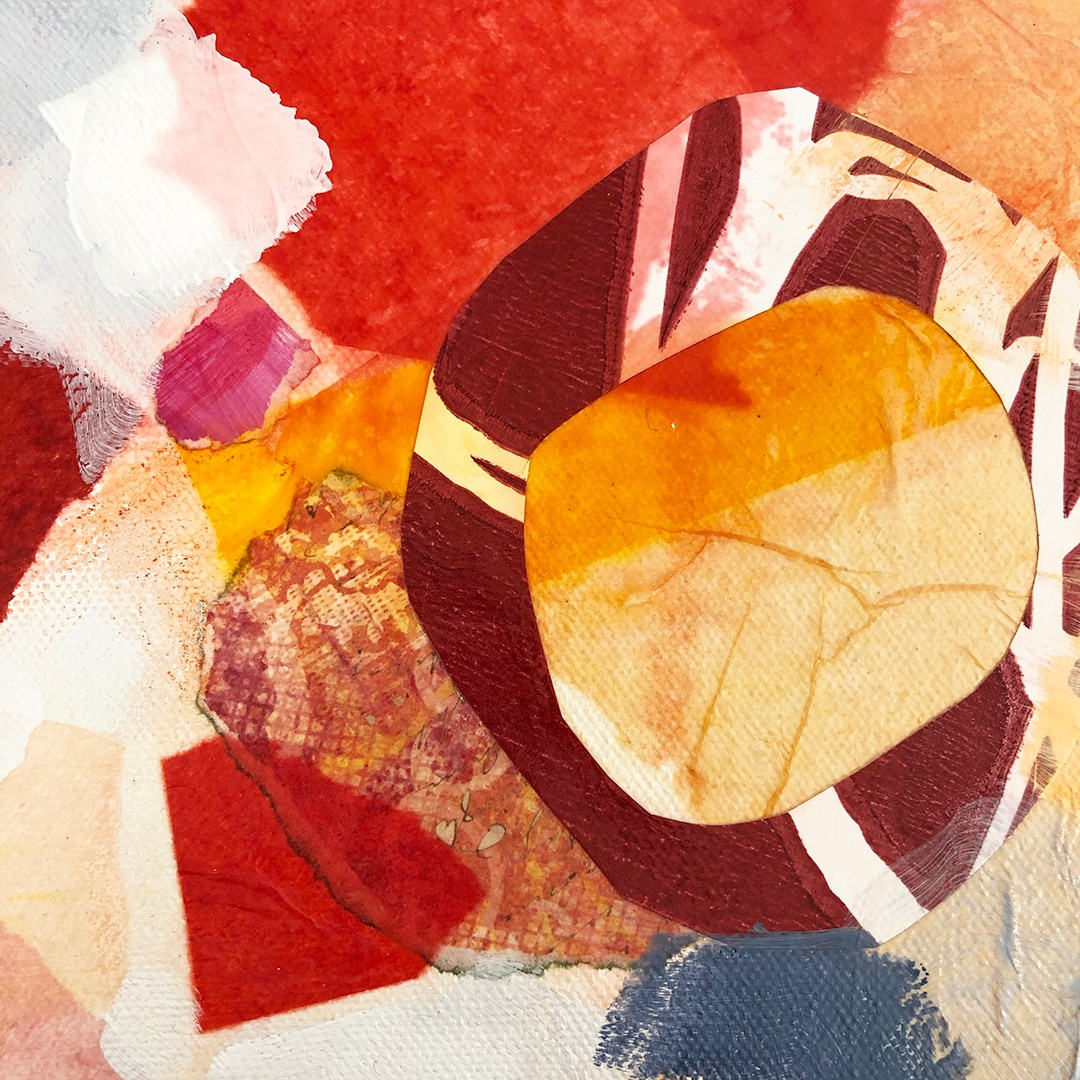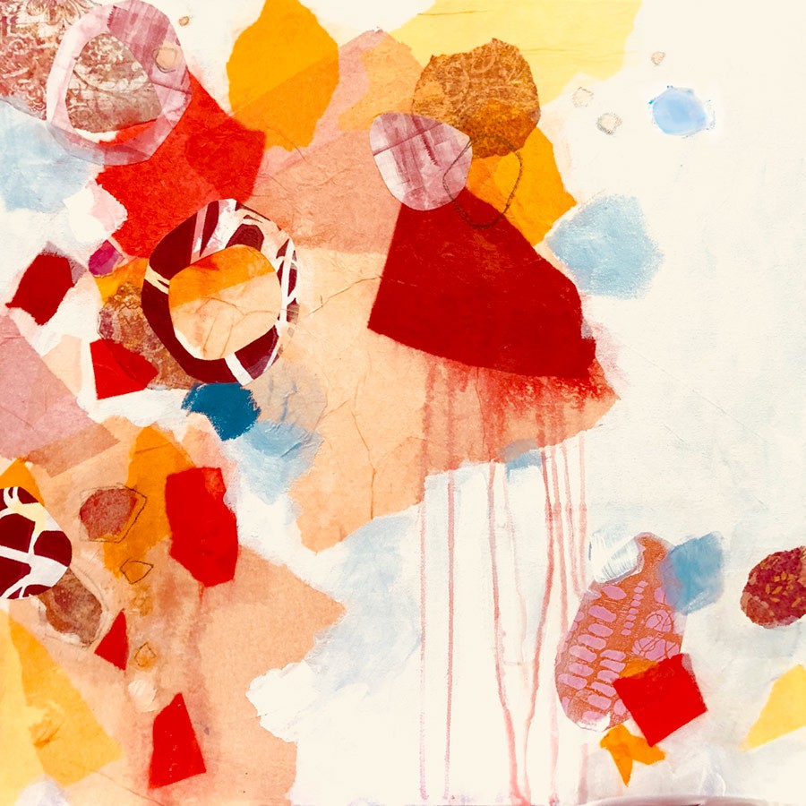 Mixed media artist, Kathy Ferguson, paints colorful abstract settings that are whimsical, richly layered, and complex.