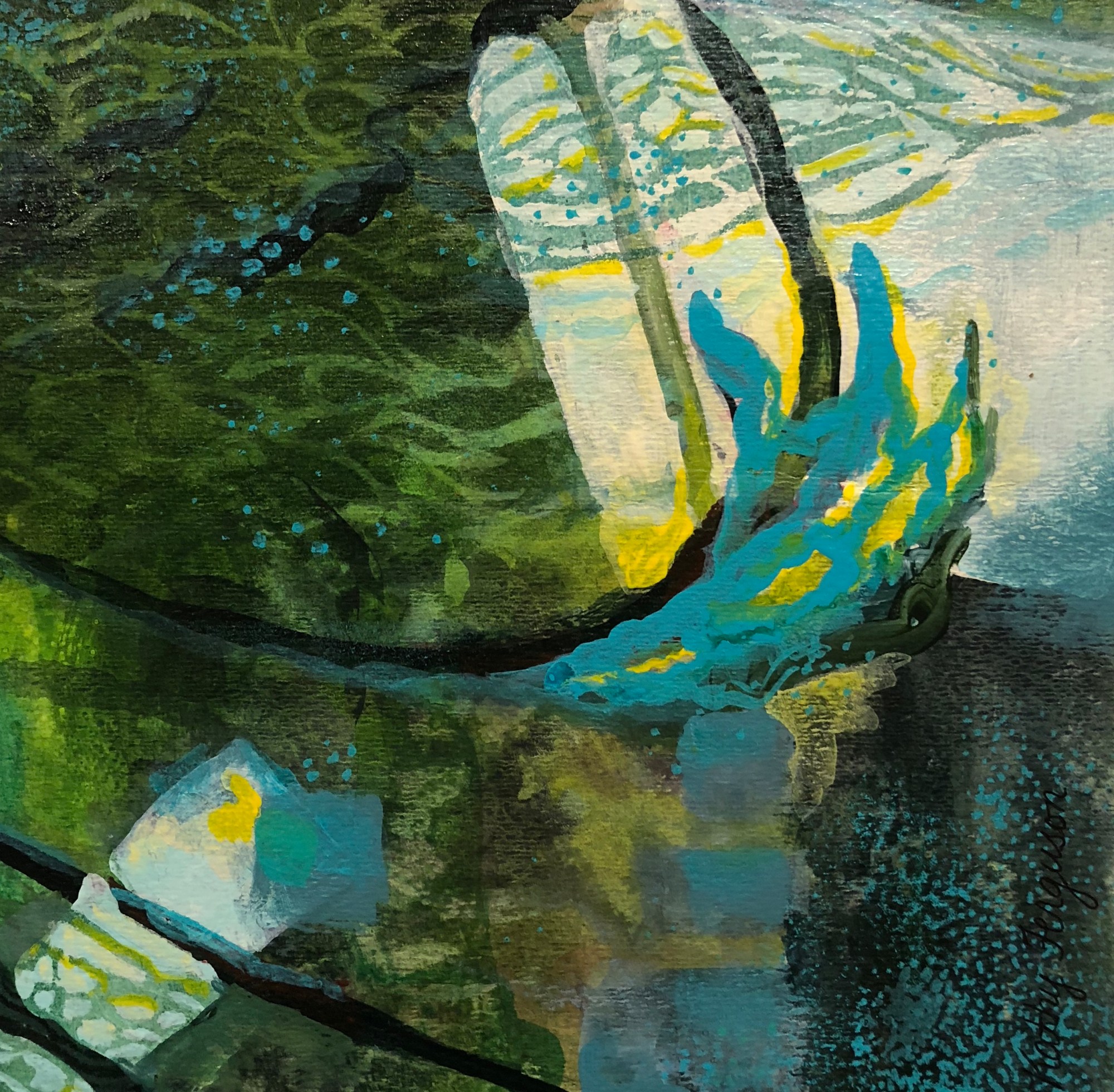 Mixed media artist, Kathy Ferguson, paints colorful abstract settings that are whimsical, richly layered, and complex.