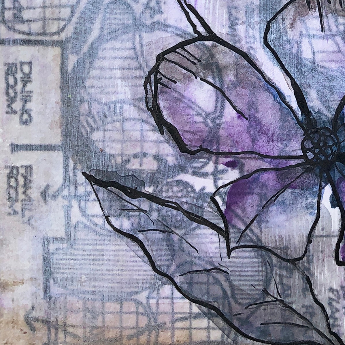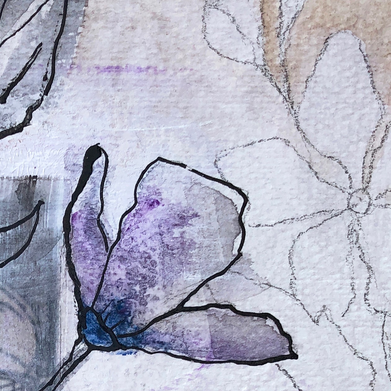 “Periwinkle” is a softly purple-tinted mixed media flower painting. Created with collage paper, transfers, acrylic, watercolors, and India ink. It is one in four painting collection of flowers. All four paintings look beautiful and cohesive when hung together.