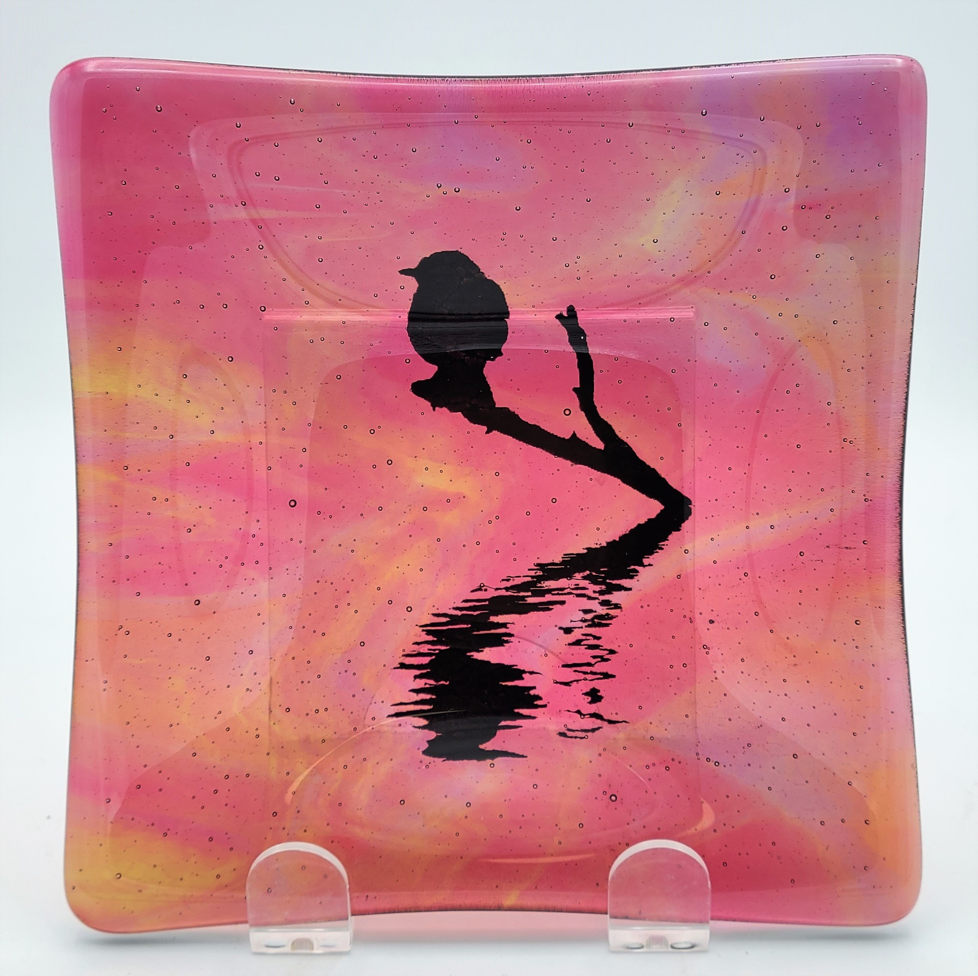 Plate-Bird on Branch on Cranberry/Blue/Green Streaky