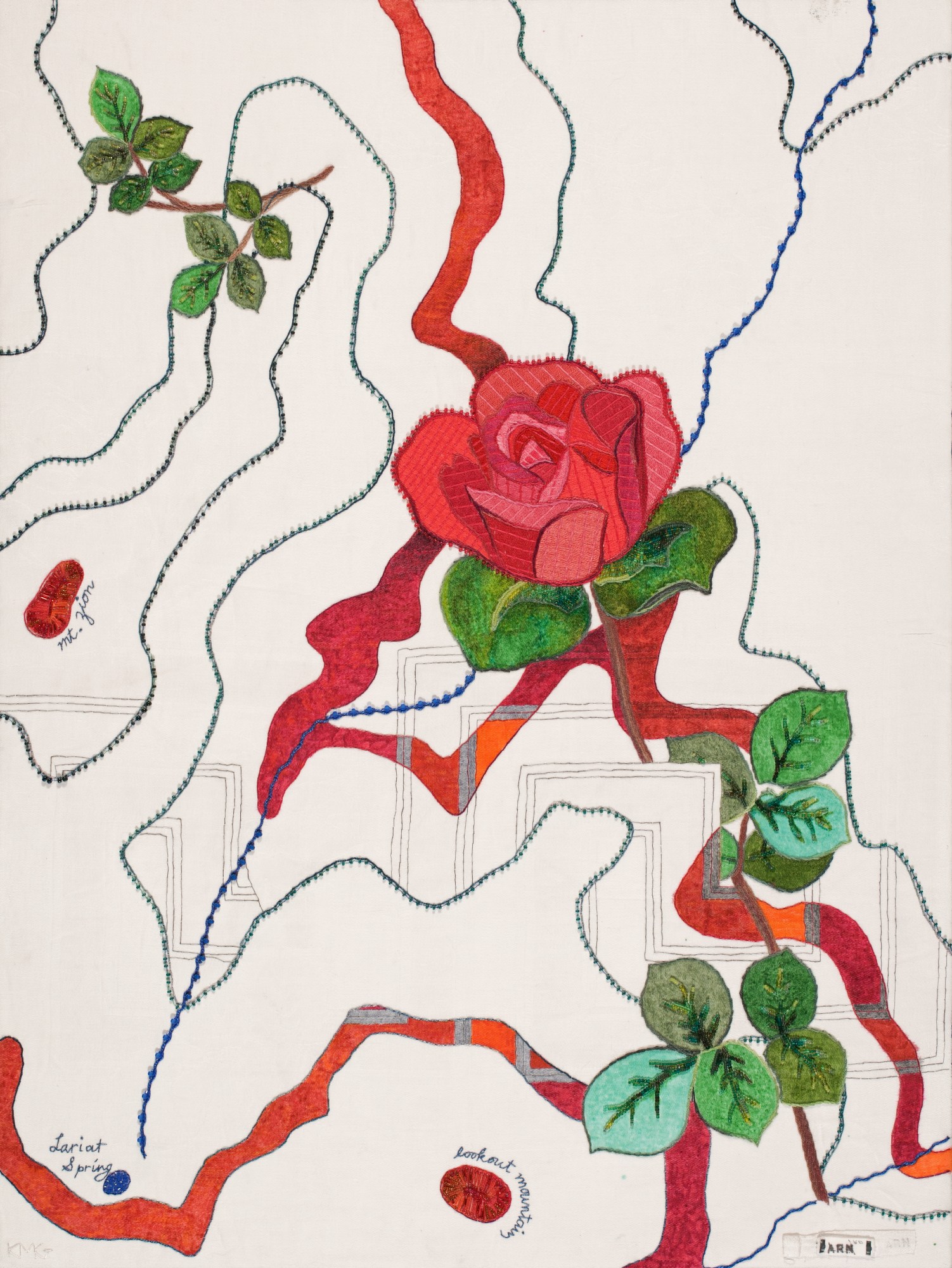 This piece features the rose and geometric pattern woven into the damask tablecloth that I used for the background. Working with the image embedded in the cloth makes me feel connected to the designers and makers who created the cloth, as well as my great-grandmother, from whom I inherited the tablecloth. The tag in the lower right corner with 'ARN' printed on it is the dry cleaner's tag that was used to identify clients' laundry. Her last name was Arnold.