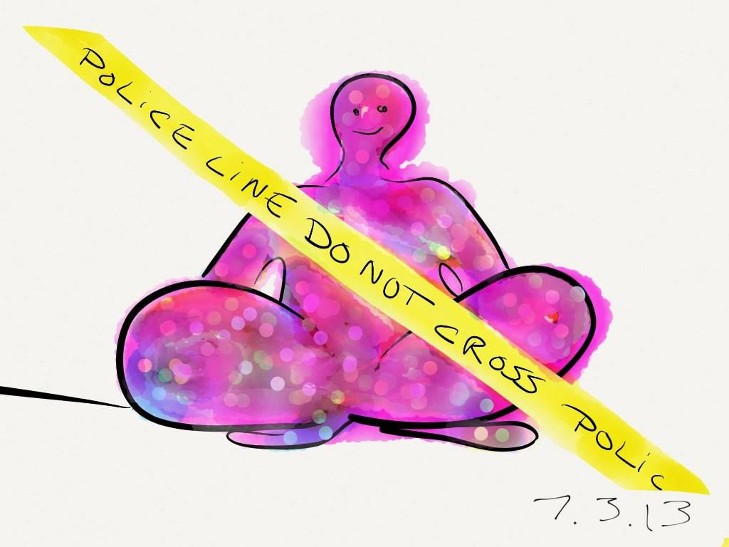 Pink figure sitting cross legged with yellow strip Police line Do Not Cross Police.