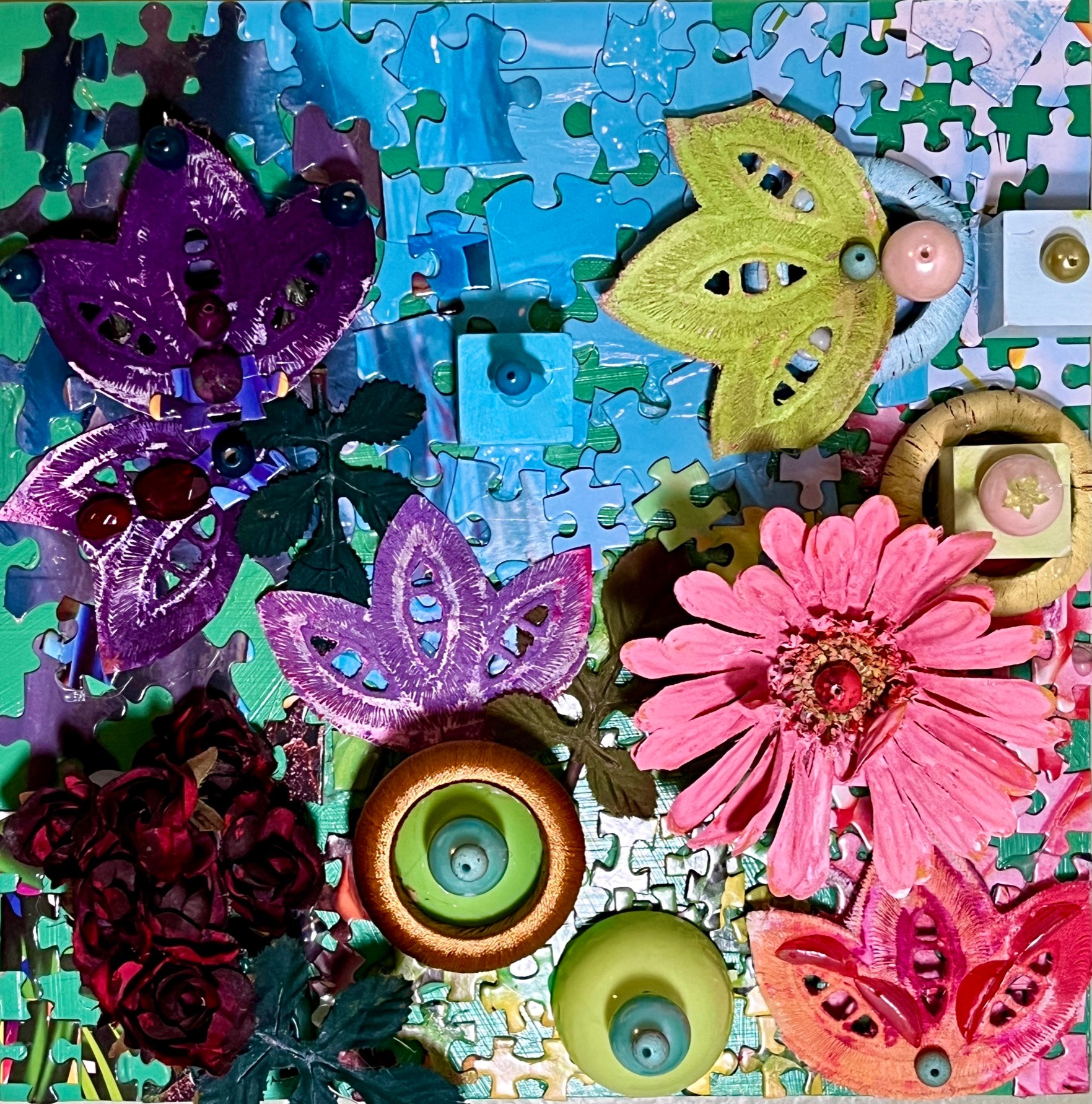 Created with recycled materials, these lively pieces ask you to come look closely. Feathers, puzzle pieces, beads...what else is creatively reused to suggest a garden?