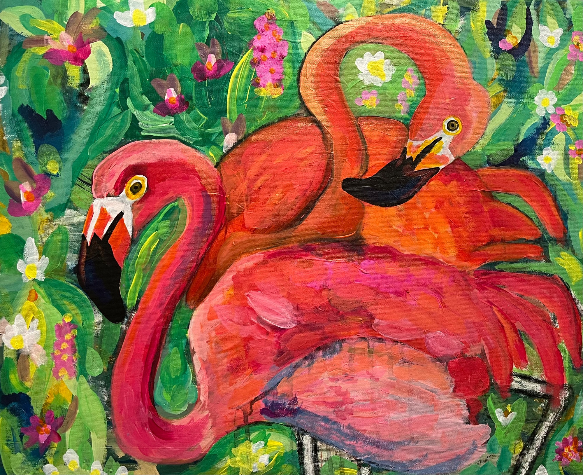 - Subject Matter: flamingos, greenery