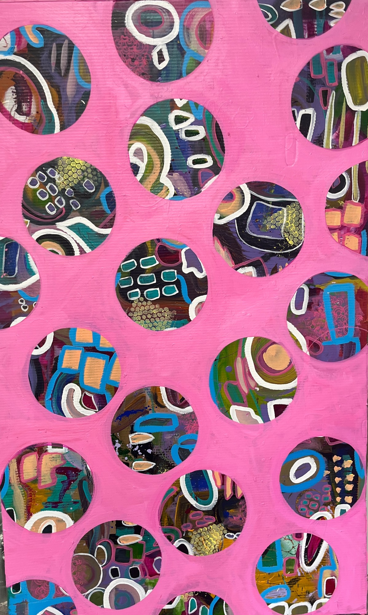 I always love what is underneath…the way a painting starts out is usually so different than where it ends up. The pink on this painting is a perfect complement to the darker anstracts underneath.