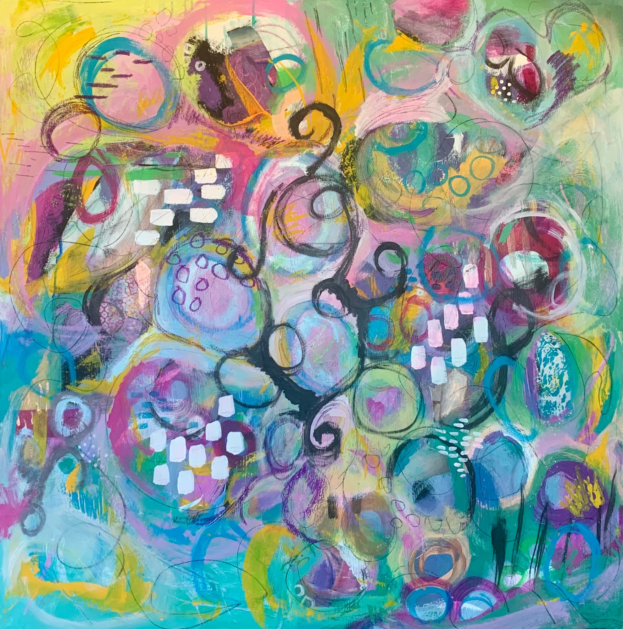 A dreamy state of mind inspires this painting. Hang it over your bed and have sweet dreams! The contrast of the pastel colors with the bold black abstract center design is something I just love!