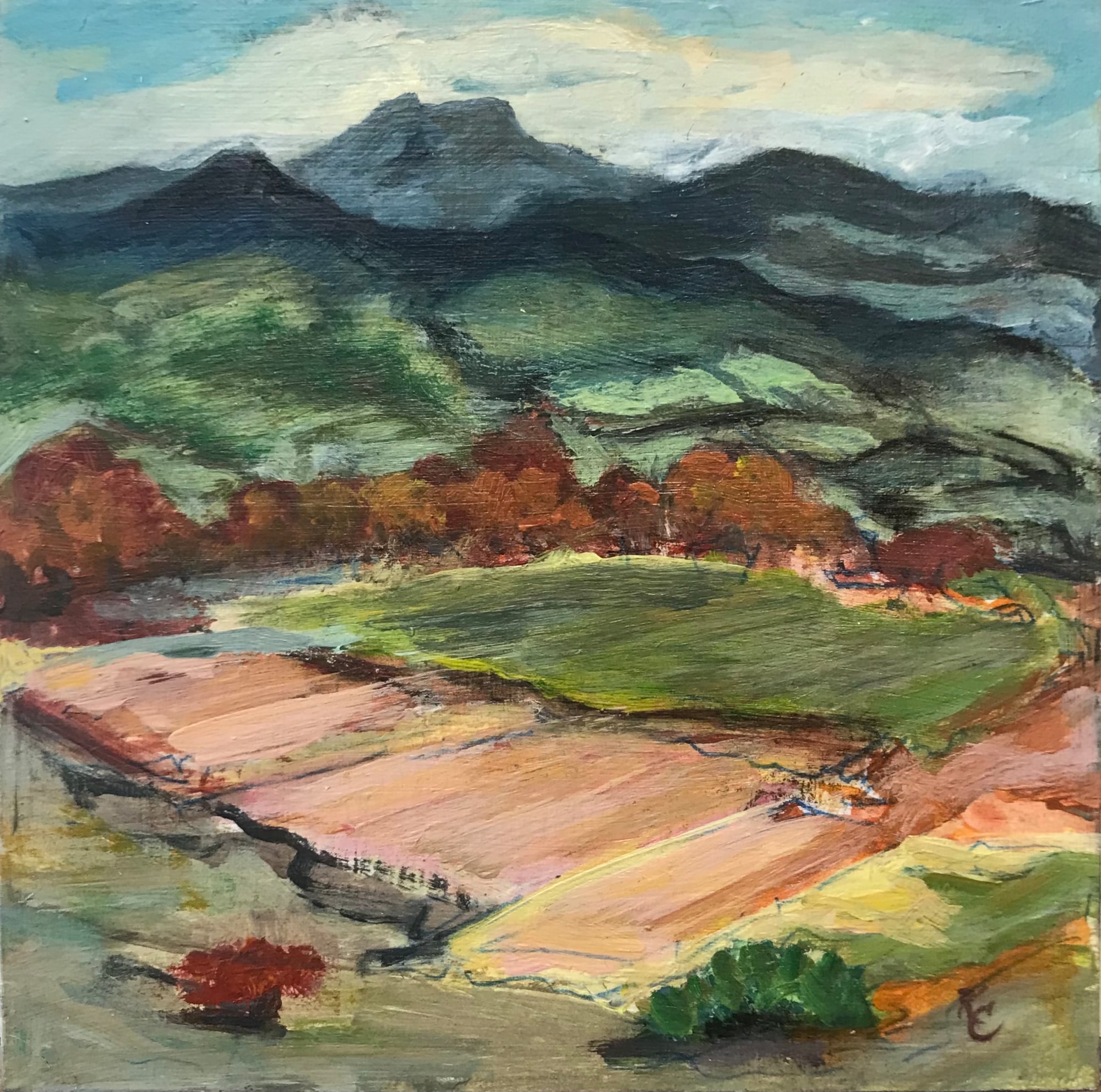 MessageA small format acrylic painting. I adhered silk to the panel first because I like the surface texture it provides through the gesso. View of the eastern hills outside of Ashland Oregon, Southern Oregon wine country.