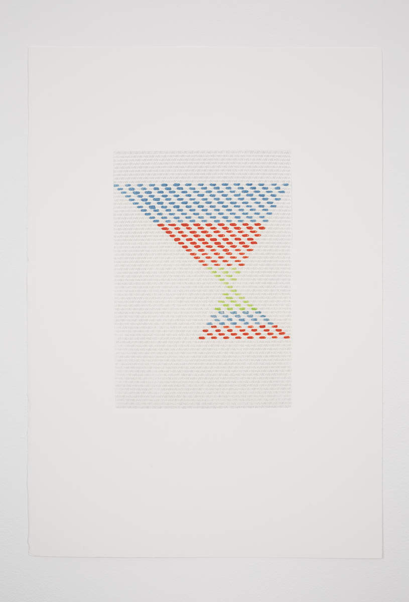 Katy Dove participated in The Associates exhibition at DCA in 2009 and following this worked with DCA Print Studio to produce this suite of four new prints. These works form a series that the artist refers to as ‘Audio Visual Musical Forms’ – a title inspired by Norman McLaren’s 1967 publication, which issues a visual index for a range of established musical forms, blurring the boundaries between formal musical notations, diagrams, lettering and abstract form.