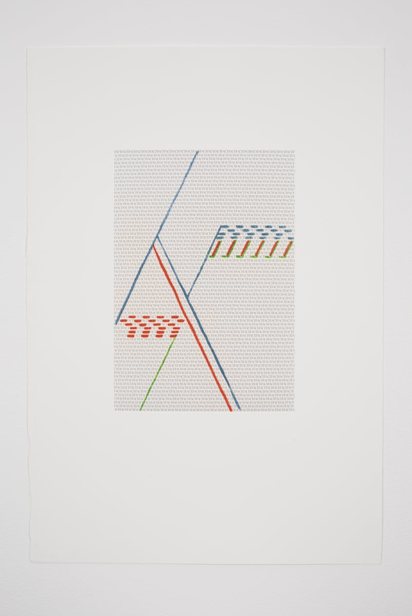 Katy Dove participated in The Associates exhibition at DCA in 2009 and following this worked with DCA Print Studio to produce this suite of four new prints. These works form a series that the artist refers to as ‘Audio Visual Musical Forms’ – a title inspired by Norman McLaren’s 1967 publication, which issues a visual index for a range of established musical forms, blurring the boundaries between formal musical notations, diagrams, lettering and abstract form.