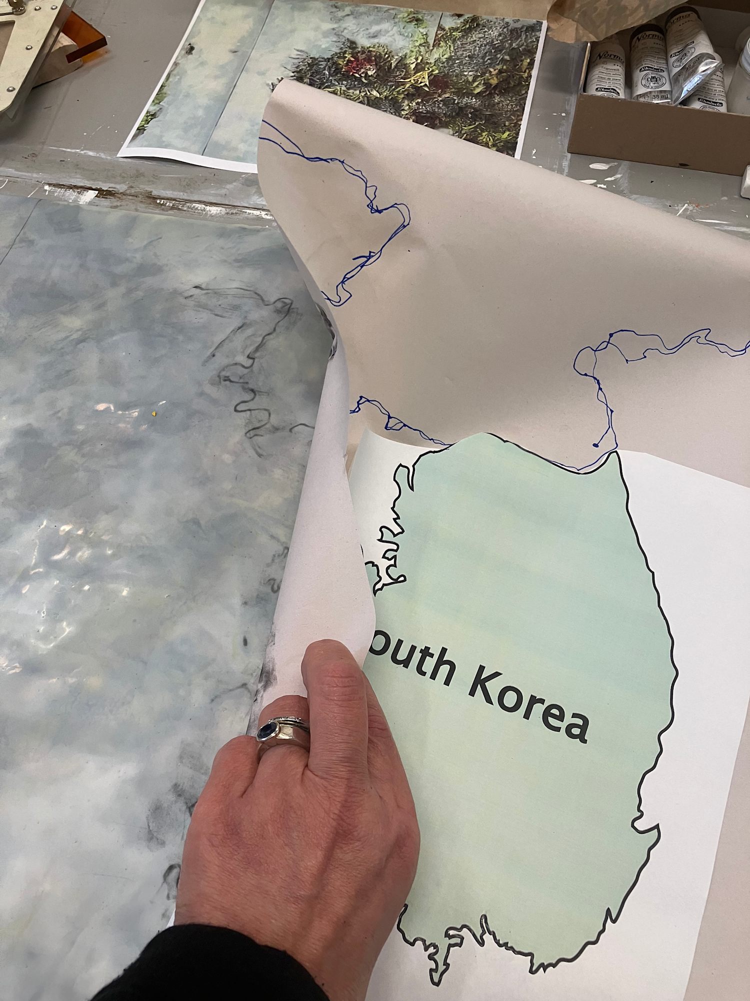 MessageIt's Korea not Florida. I thought of calling it that. My daughter and I were both born in Korea (and appear in the painting.) We were both two years old when we were released to travel. Thoughts about starting points, movement, mysteries, distance, and memories unremembered float around in this painting.