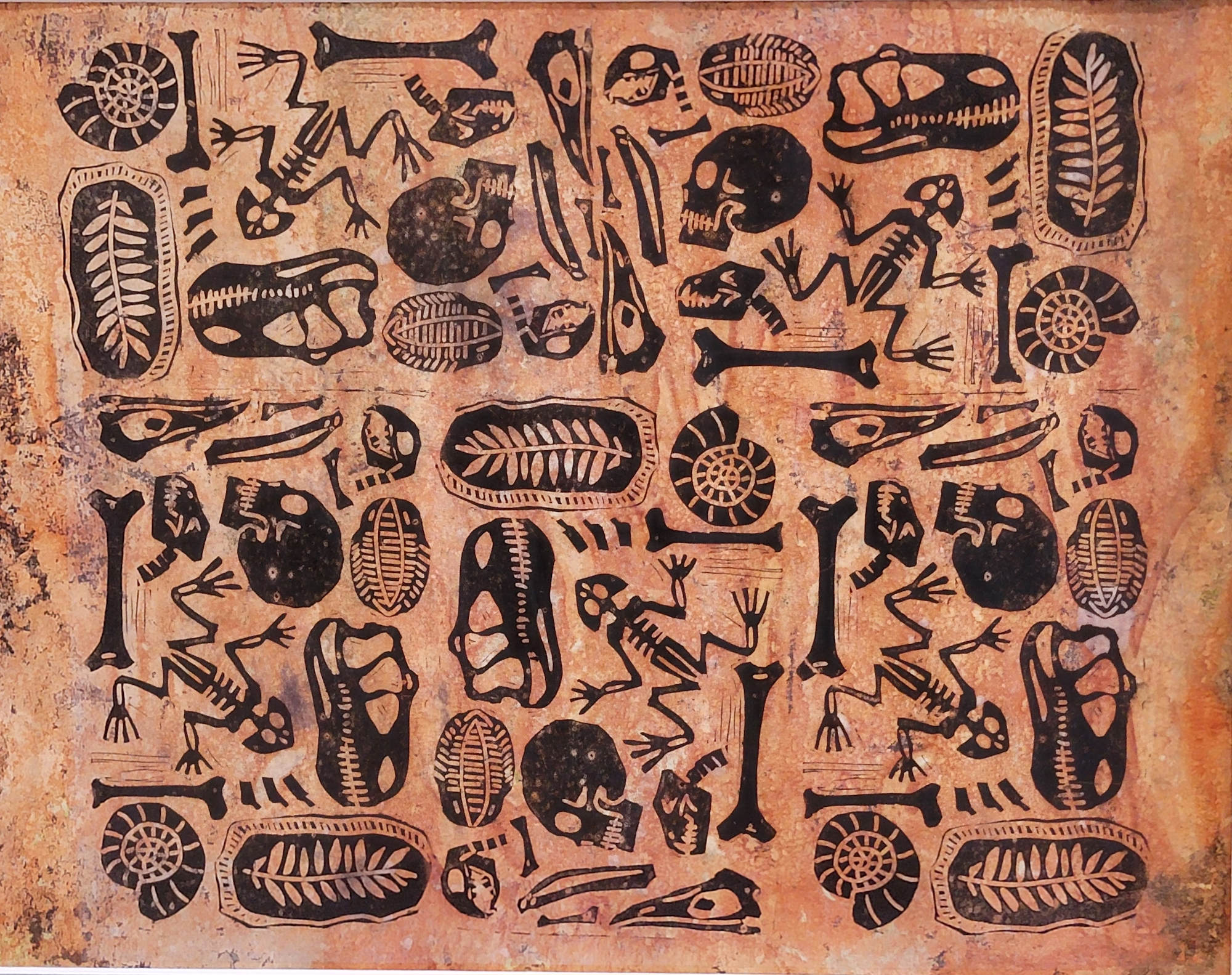 This is a roughly 11 x 14 inch hand pulled print with oil based block printing ink on wet strength tissue paper mounted to a painted surface.