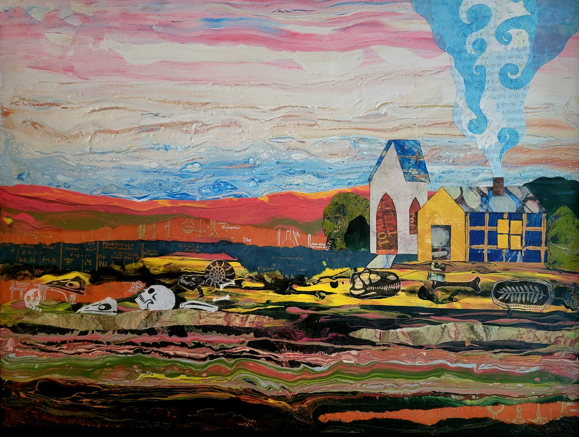 Framed I used a technique of mixing and pouring on paint in various 'concoctions' to create the textured and colorful base, or underpainting, in a form that roughly resembled what I was wanting to express. From there I added a collage of found papers, and sometimes more paint or other mediums. I tried to achieve a cohesive look in these multiple layers and mediums so that they all played nicely together. In Time Goes On, a bit of my science and anthropology background peeks through. As I was creating the colorful layers of earth, as well as the layers of art mediums, I was thinking about how much history we are oblivious to as we go about our business today. As a child I roamed our farm and found arrowheads and bits of pottery, fragments of evidence of previous inhabitants of the land. Kansas is also known for its rich fossil fields, also evidence of days gone by. One day the current inhabitants will also be a thing of the past, either remembered or not, as time relentlessly marches on. The smoke out the chimney speaks to our lives being but a vapor... here today and gone tomorrow. Not meant to be negative, just how we all hold our place in the timeline.