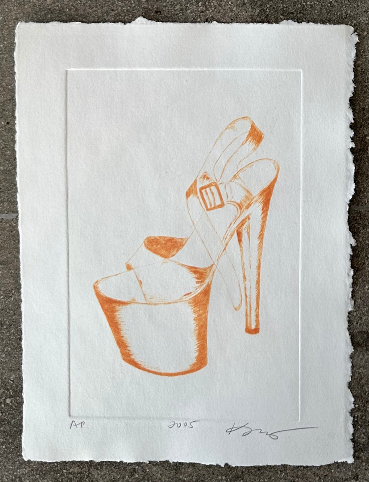 MessageOrange ink intaglio print. I did various forms of sex work from 2005-2022. I learned lot about myself, developed boundaries and worked through oceans of grief. I’ve kept almost every pair of shoes I’ve danced in over the years and have begun to document them through photographs, paintings, and these drypoint prints. Each title is the year I worked in the shoes.
