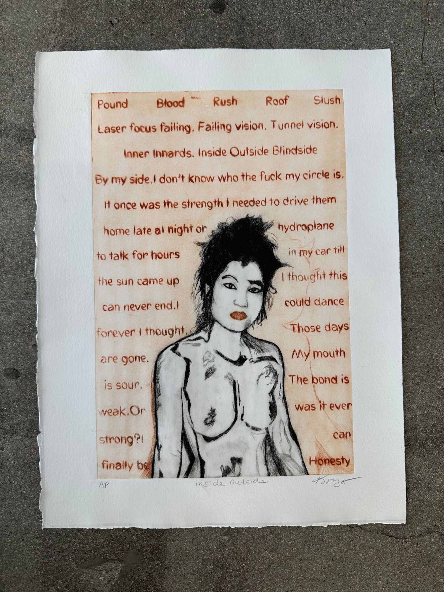 Inside Outside / Sanguine / AP by kayla tange  Image: Black and sanguine ink intaglio print. Etching based on a photo taken by Luka Fisher, text by Kayla Tange