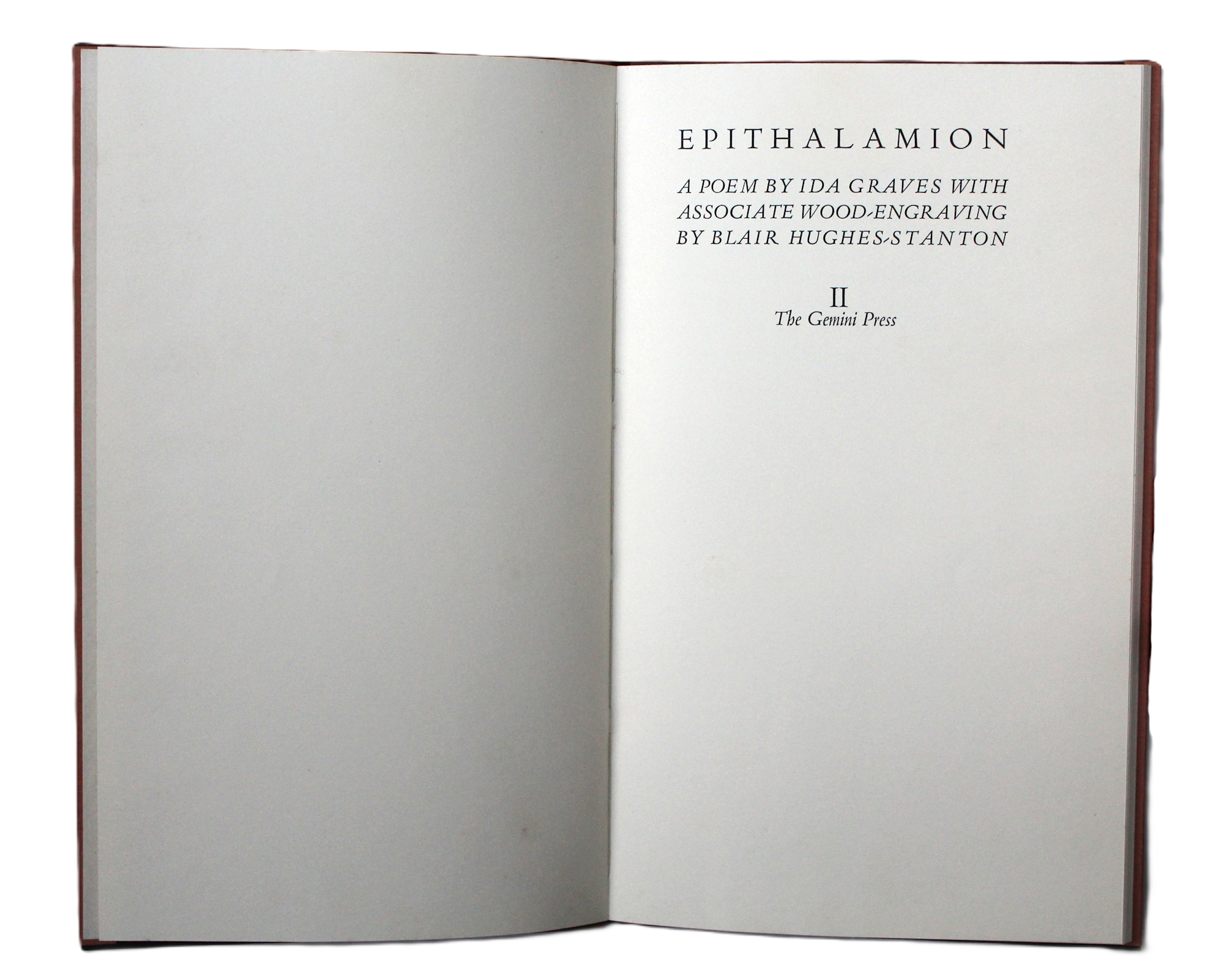 Epithalamion, a poem by Ida Graves, with associate wood-engraving by Blair Hughes-Stanton. Published by The Gemini Press.