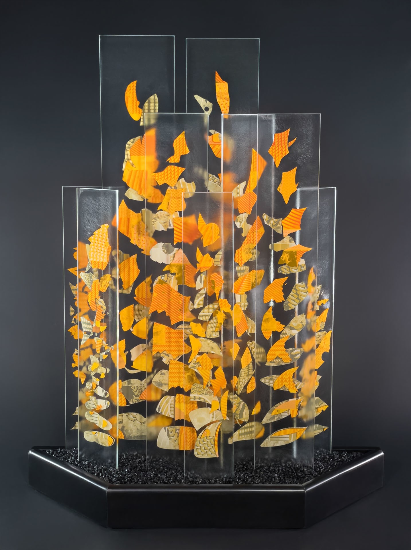 This tabletop sculptural assemblage is made up of nine silkscreen-fused glass tiles mounted into a wooden base at angles to each other. They depict abstract blinkers and headlights, flicking upward on clear glass, densely layered to suggest the flames of a campfire.