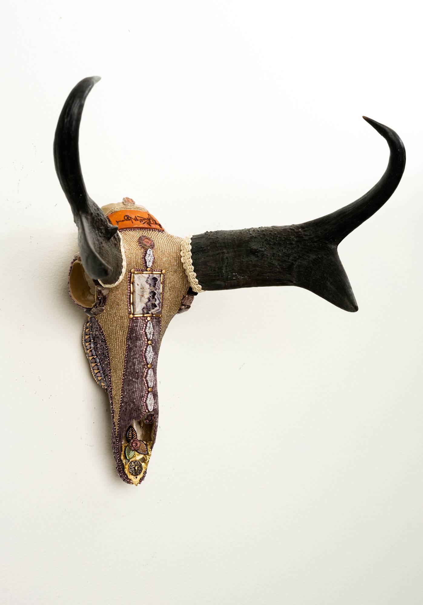 I started this pronghorn skull, which was a find at a little taxidermy shop in Afton, CO in January 2025, at the Spring Open House Event at Prairie Edge. I LOVE the light purple beads down the center of his face - they look like tiny, perfect mosaic tiles. It must be the shape of the glass bead and the way it reflects the light that give the illusion.