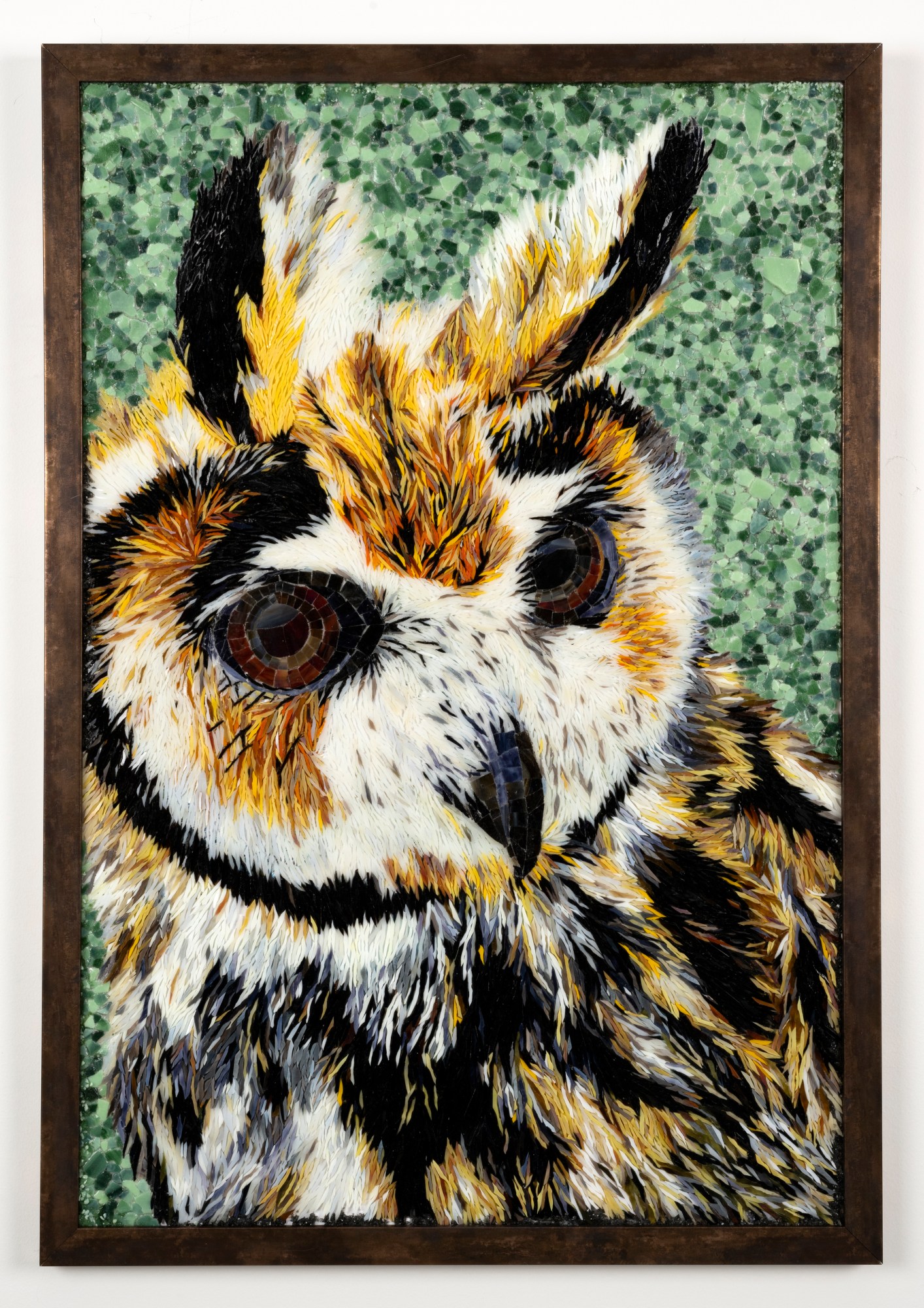 The realistic nature of the piece, while looking like a painting, is actually made up of thousands of thin shards of stained glass. Special attention is always paid to the eyes, which seem to peer out at the observer with keen interest. The direction and placement of the glass shards suggest fur or feathers in this technique.