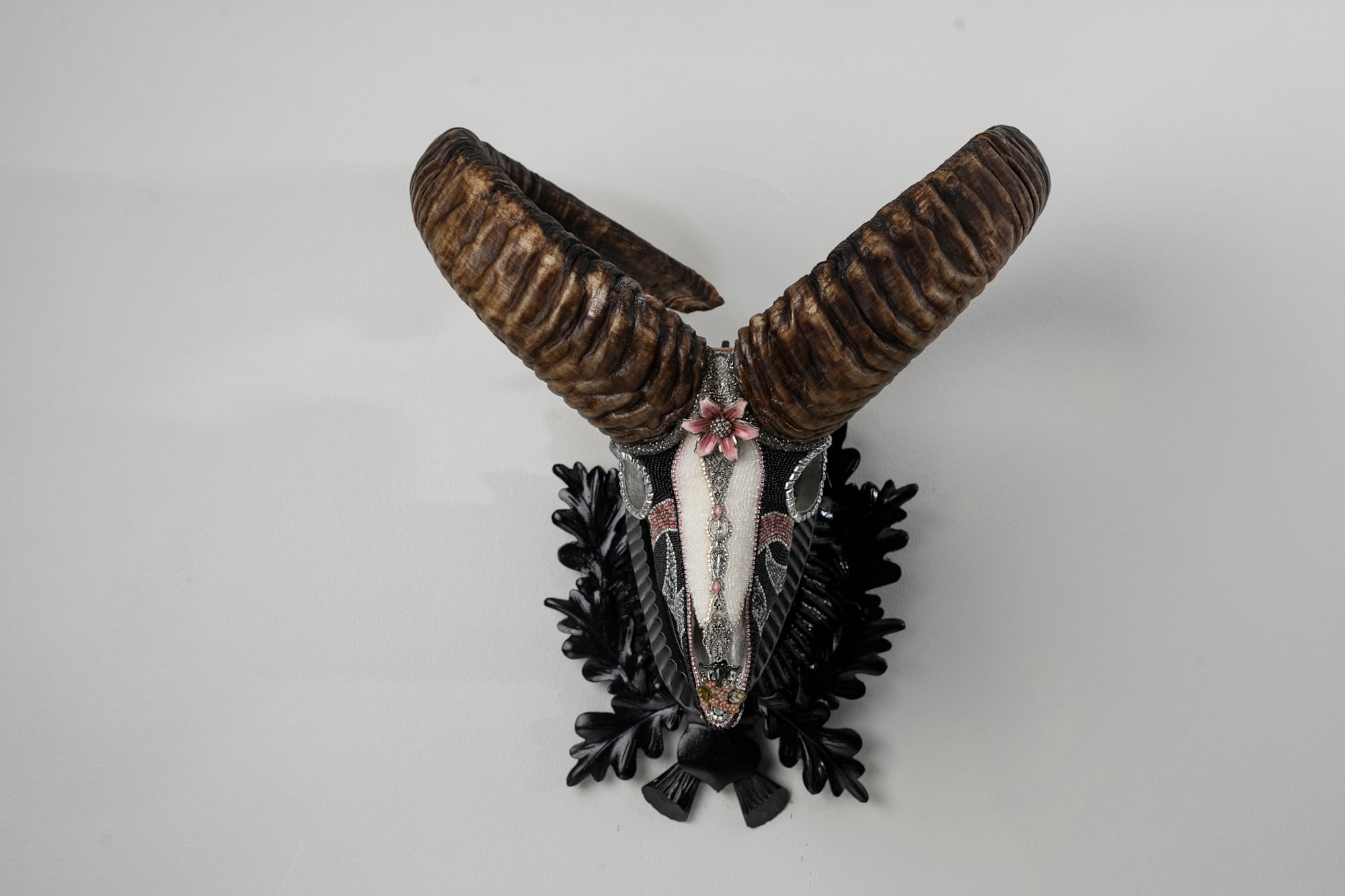 In all, I started this skull on 12/15 when I found the plaque, worked on preparing the surface during the week, and actually started beading on Saturday, 12/21. The sheep is a relatively small surface, so there isn't as much ground to cover, but, the horns are permanently adhered, so working around them is a challenge in both placement and lighting. I would say the beading part probably took me about 15 hours. I finished up late Sunday evening with a light glue wash and let dry overnight.