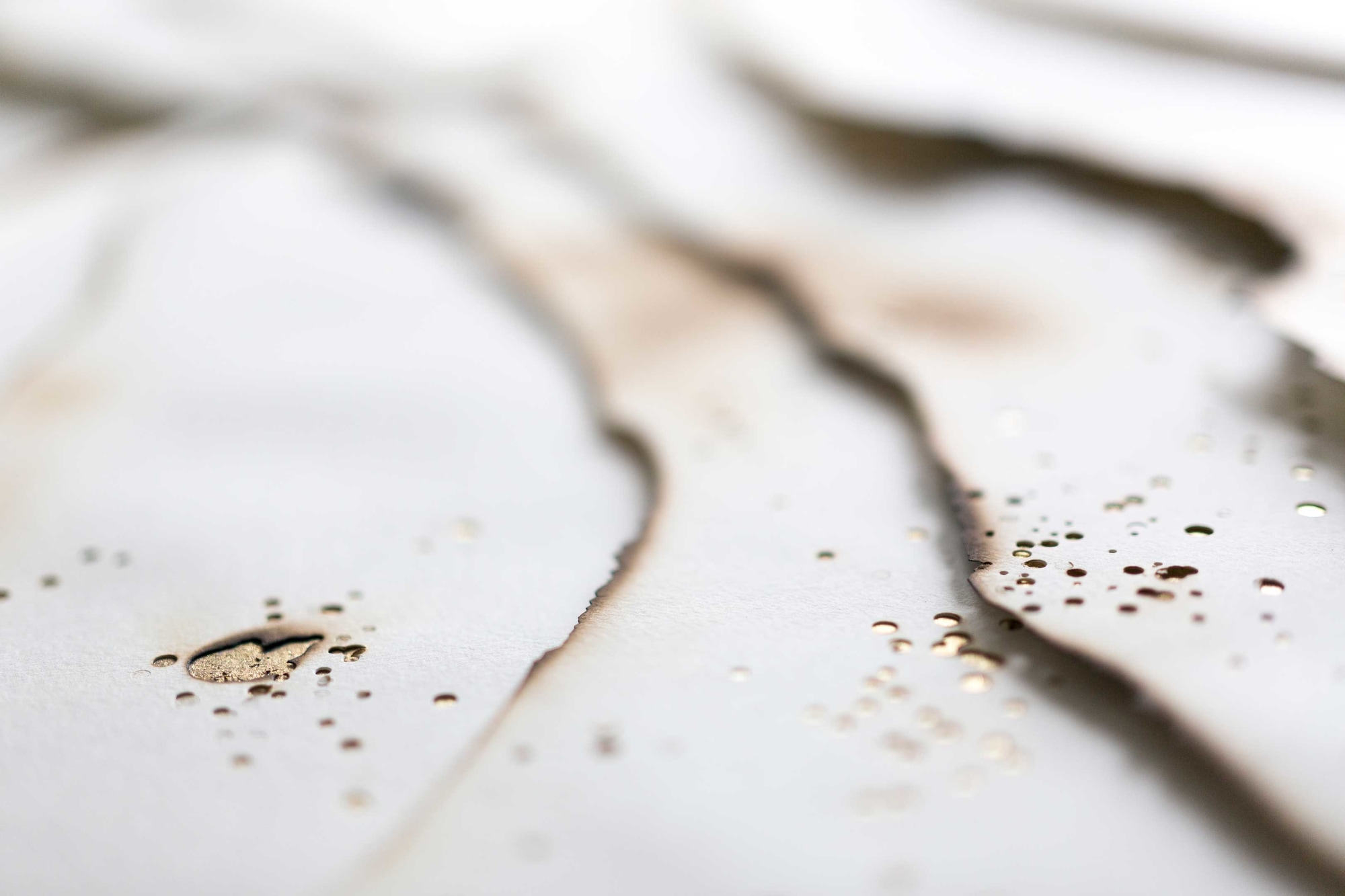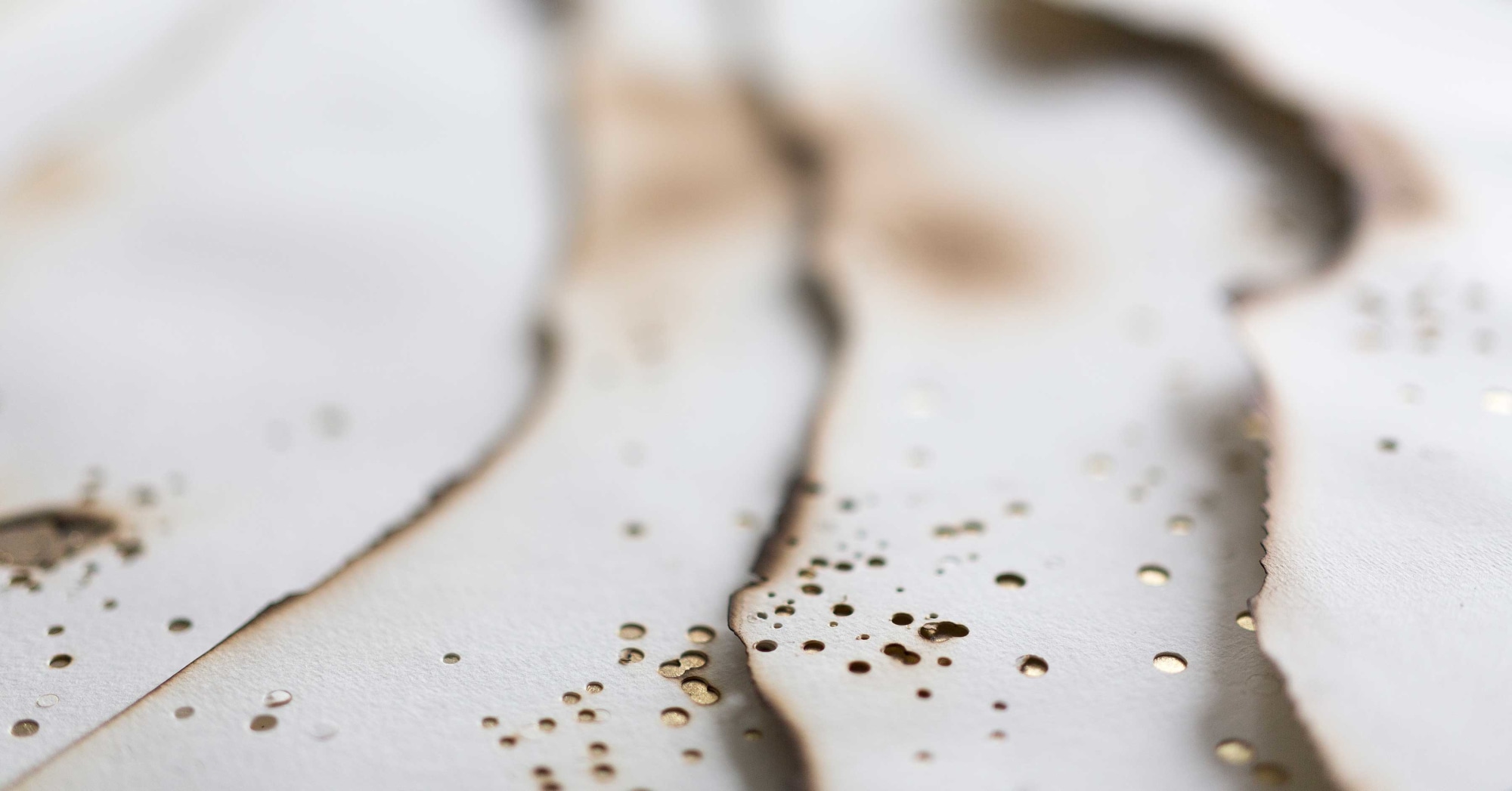 The work is dimensional paper sculpture - layers of fine art paper that are hand-cut, incised, pierced and burned, then embellished with gold leaf. Each piece is unique, given the unpredictable nature of working with flame.