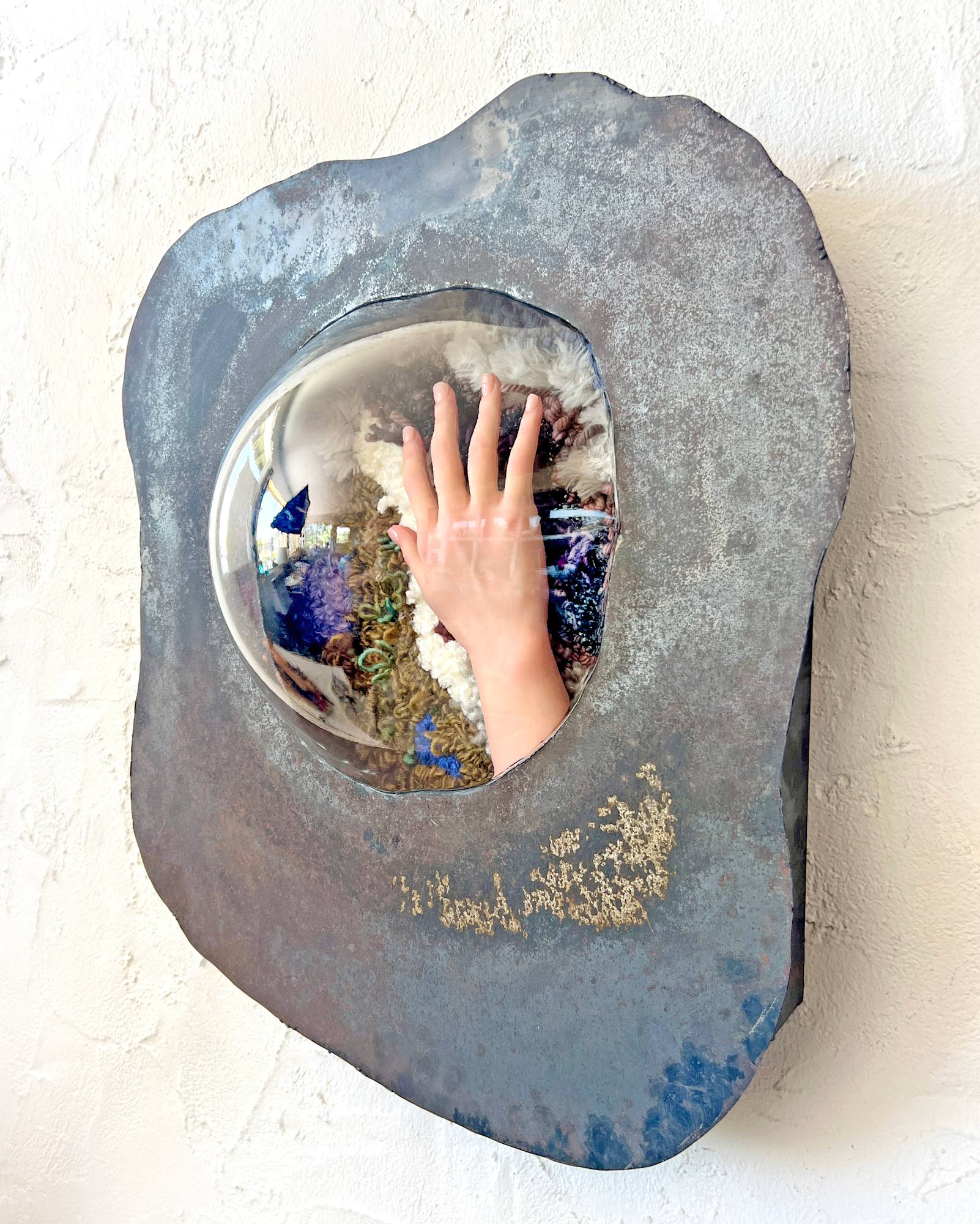 “Don’t Touch” features an eerily realistic robotic hand performing repetitive motions, its fingers trailing delicately across the plush, textured surface of a hand-tufted tapestry. One can see through a curved glass window the hand's explorations unfolding, but any actual tactile experience is physically cut off and separated from our reality. This creates an uncomfortable sensory disconnection and blocked desire to feel the same sumptuous textures ourselves. It challenges the viewer's role as passive observer, leaving them grasping for multi-sensory participation that has been specifically walled-off and put on display as some kind of bizarre private act.