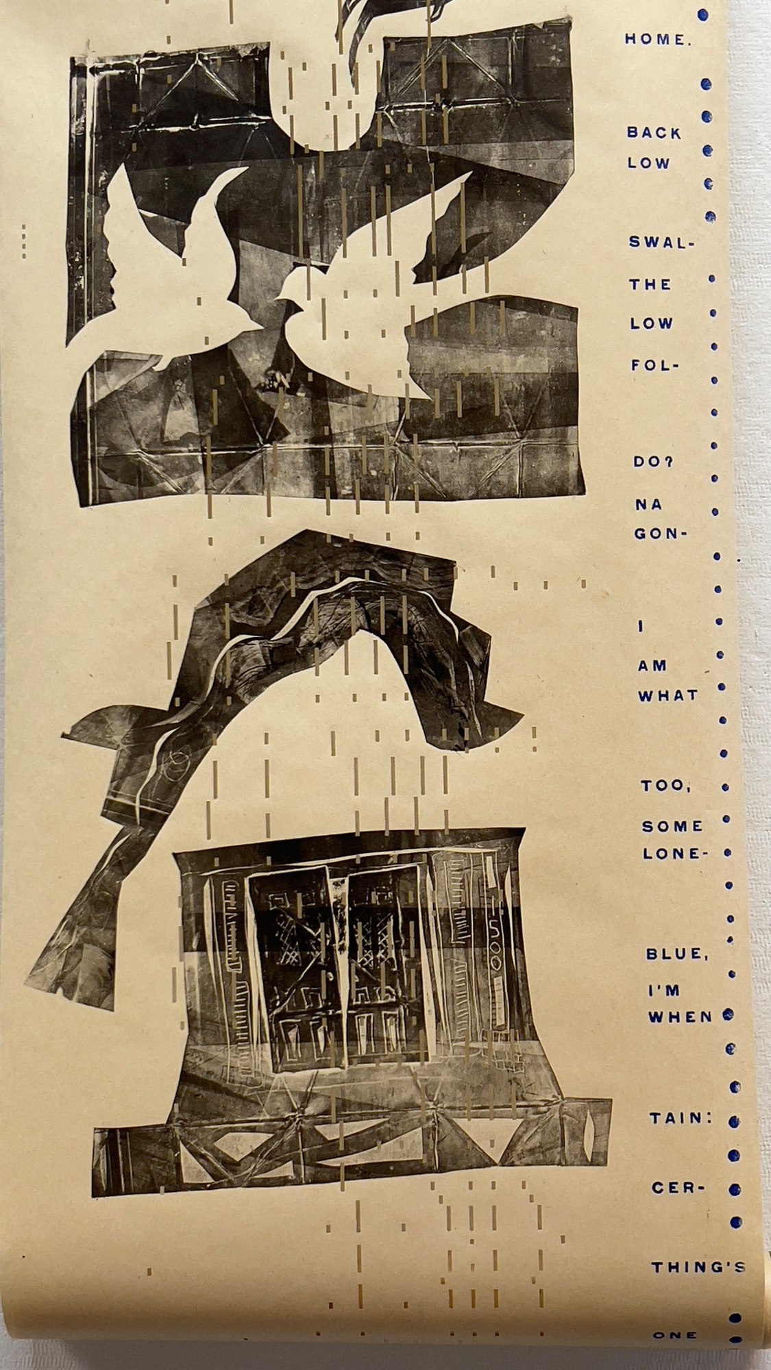 Printed on old player piano roll. Etching created on Tetra Pak and printed on press.