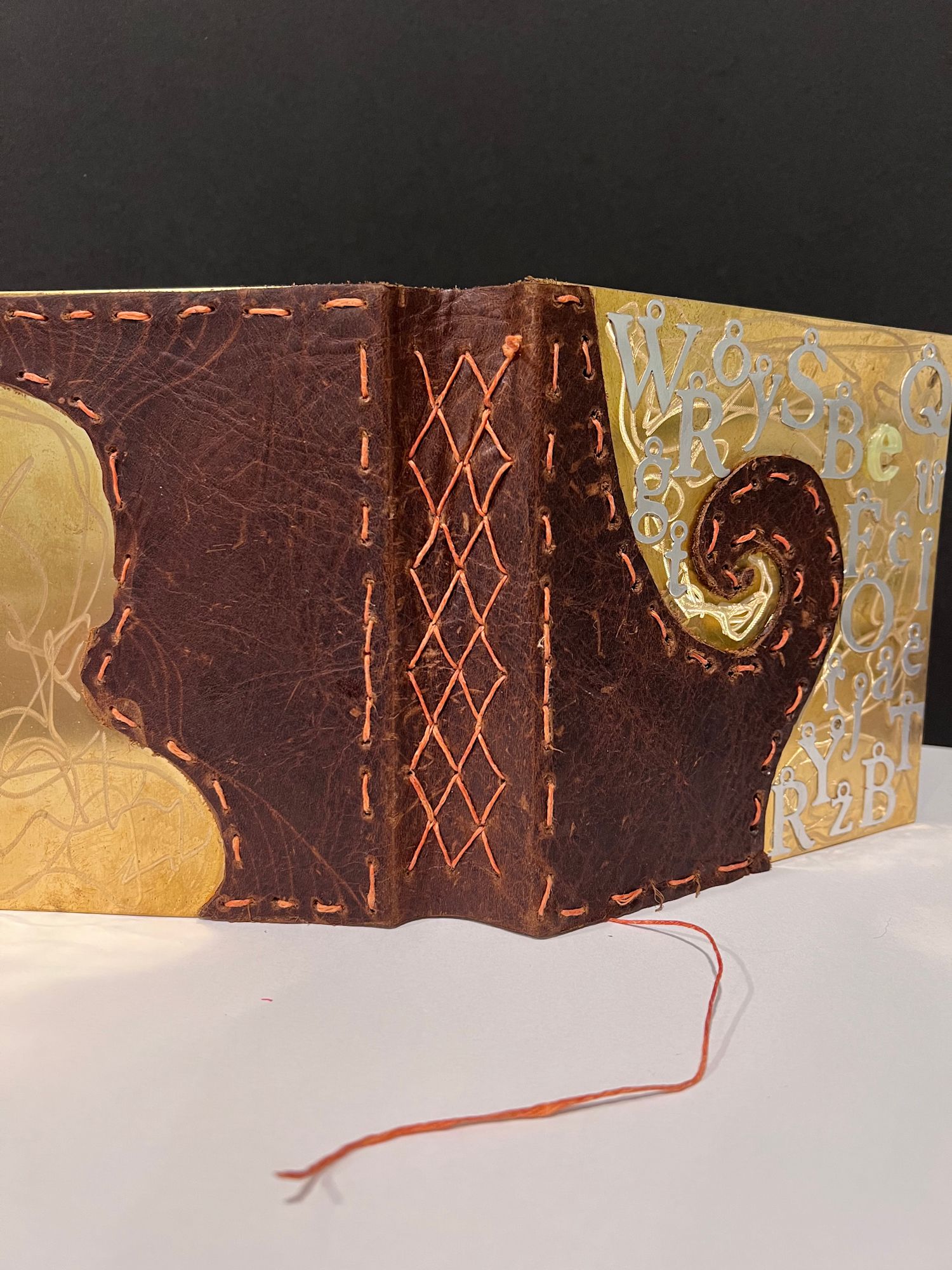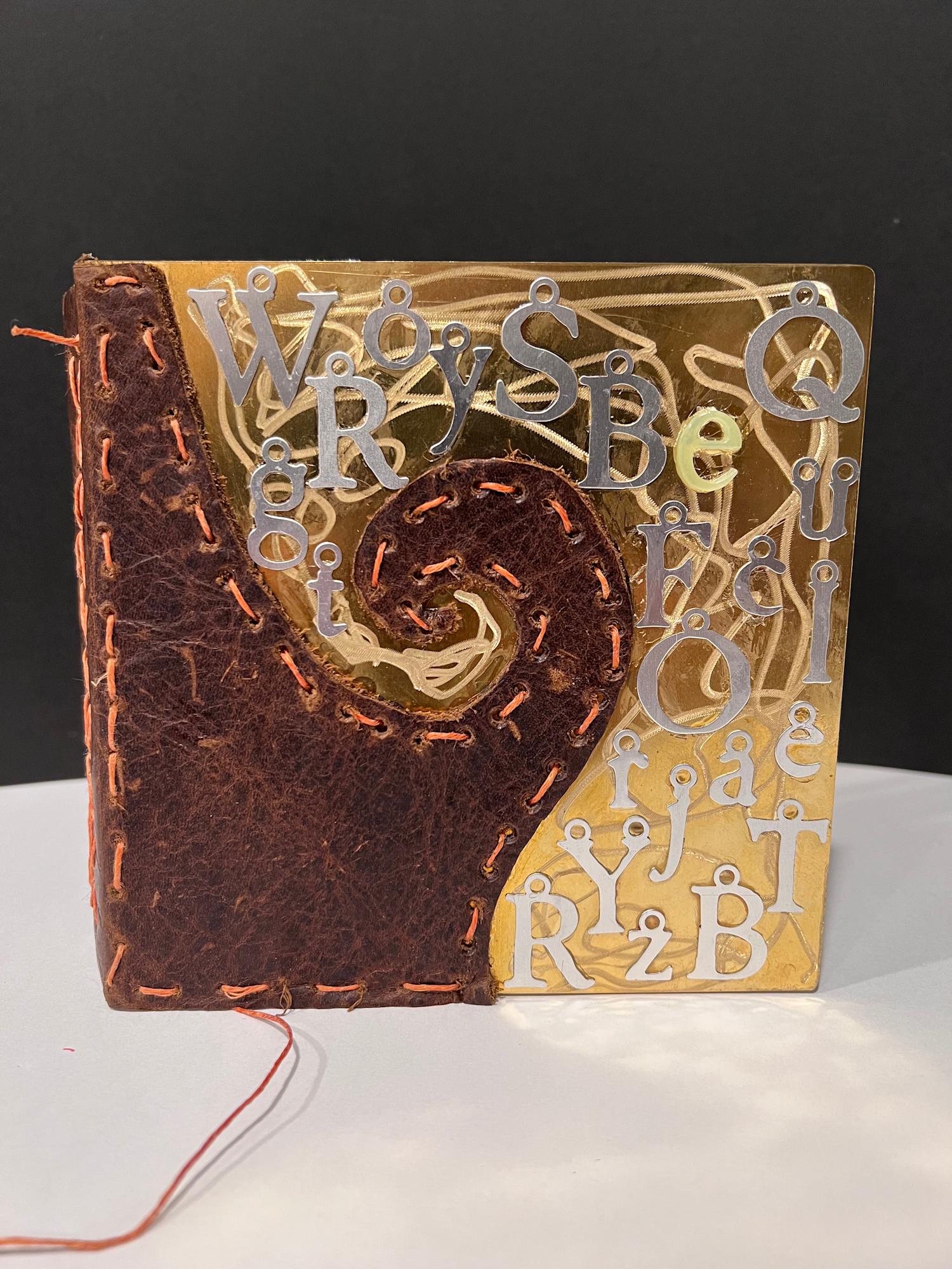 Metal cover and back. Be Quite letters on cover. Book has blank pagers