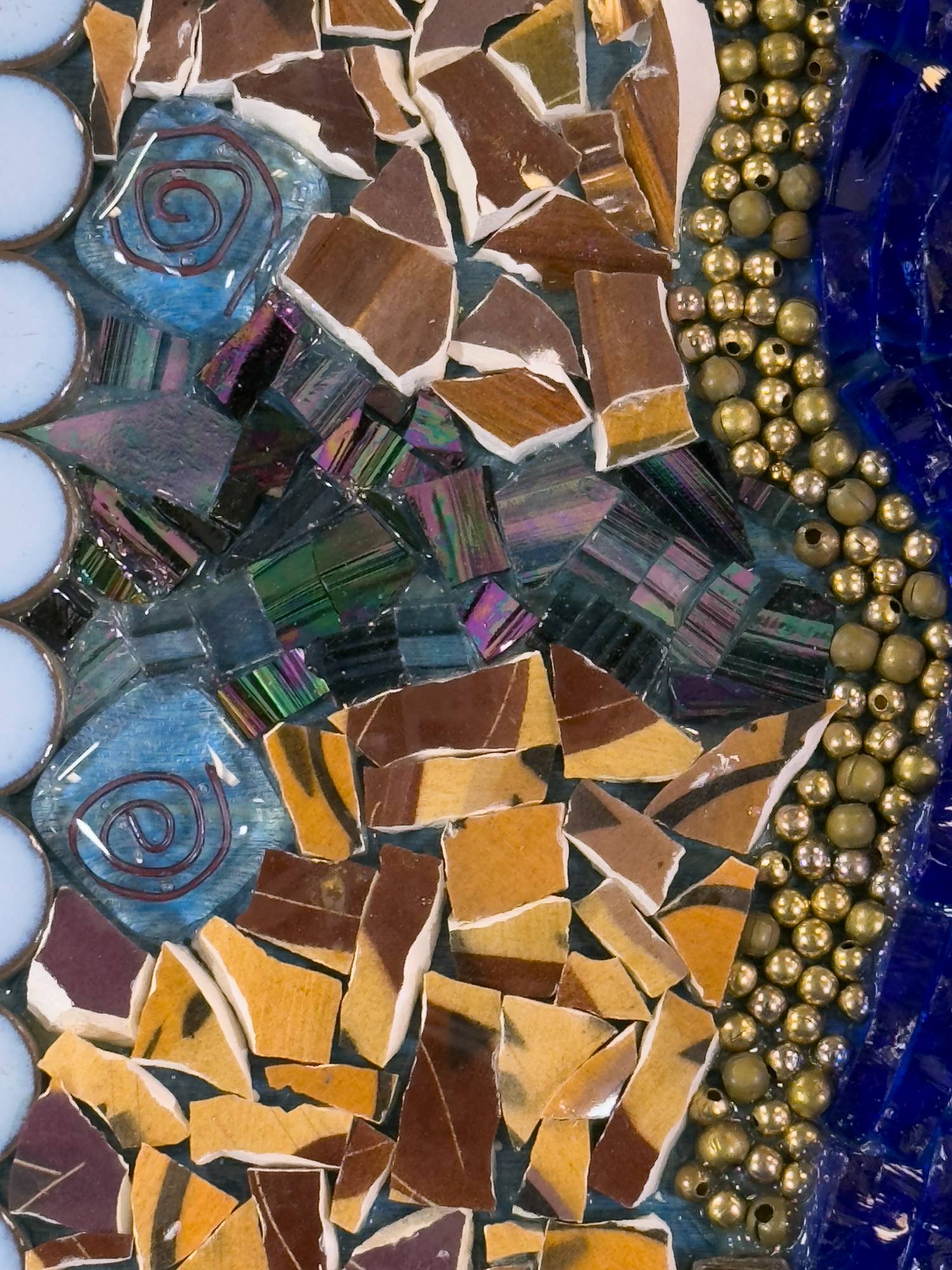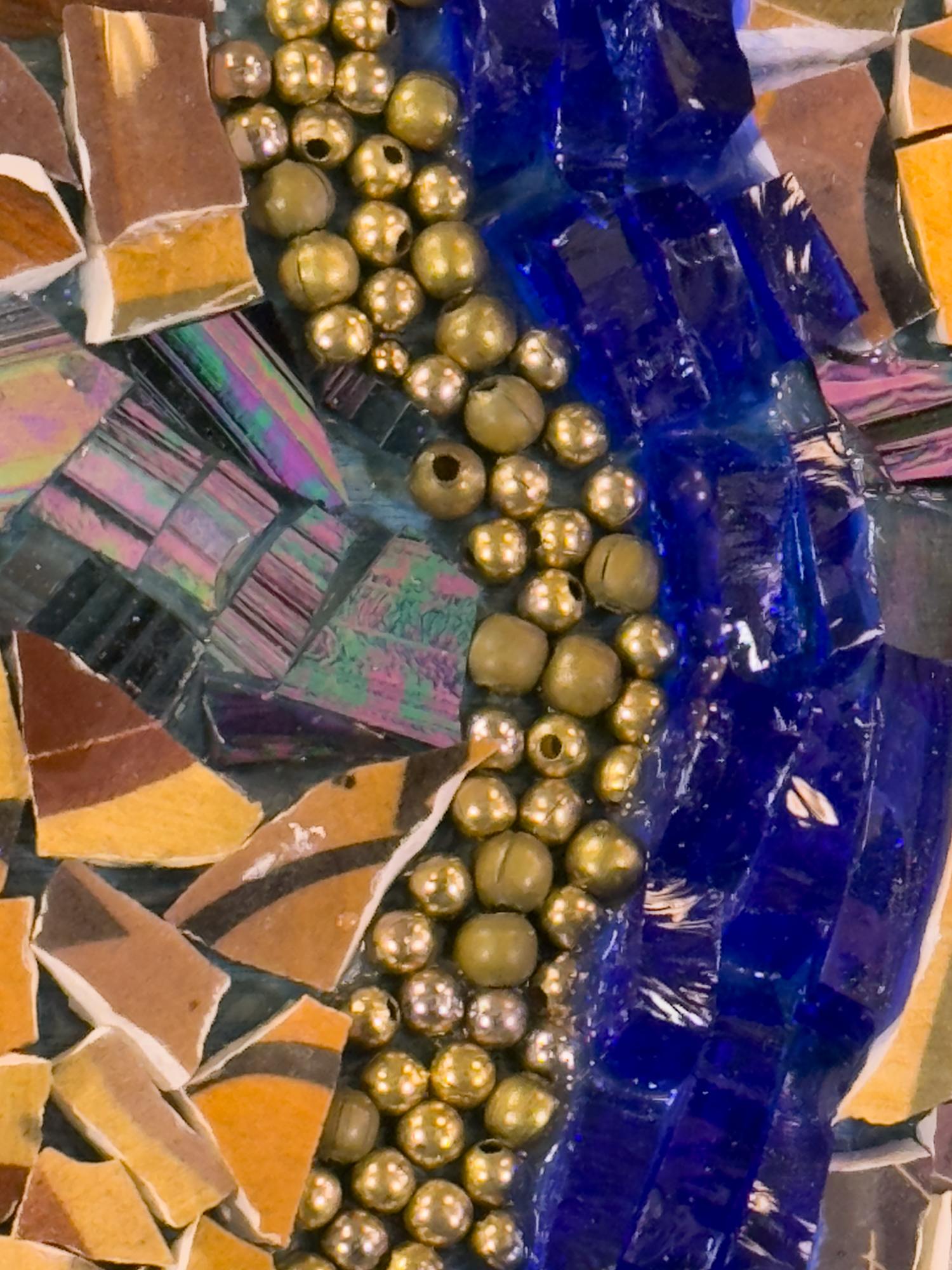 Blue painted background. Blue, brown, and maroon glass and gold beads.