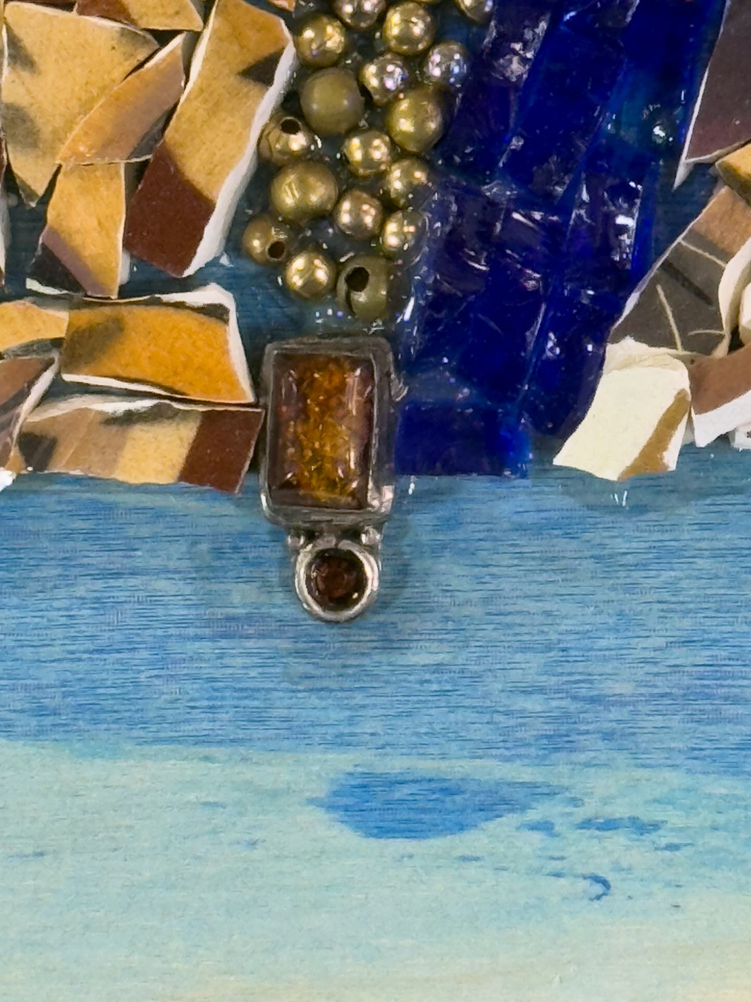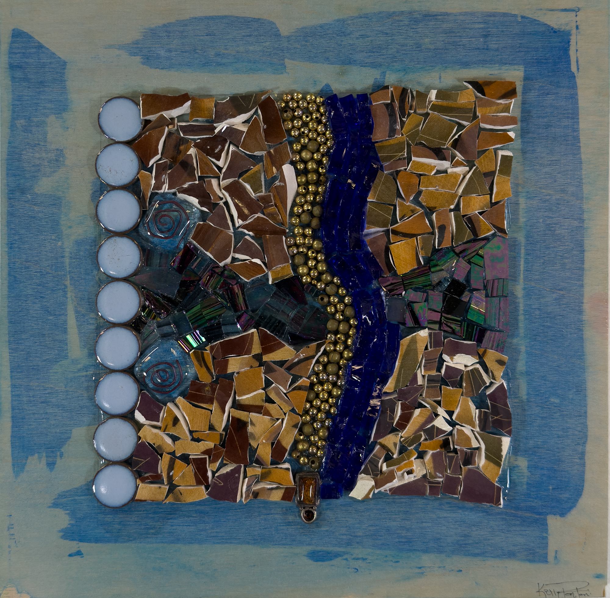 Blue painted background. Blue, brown, and maroon glass and gold beads.