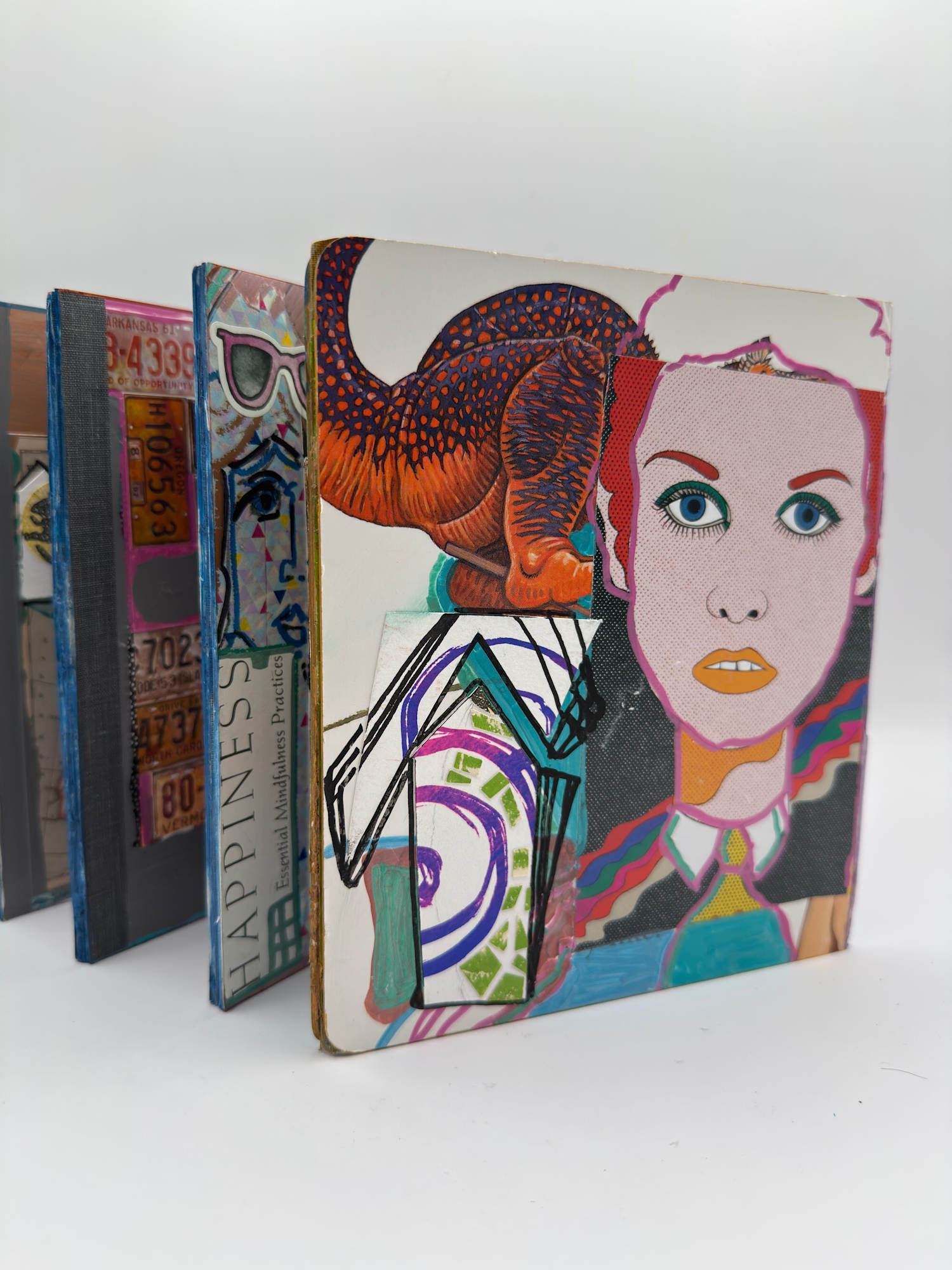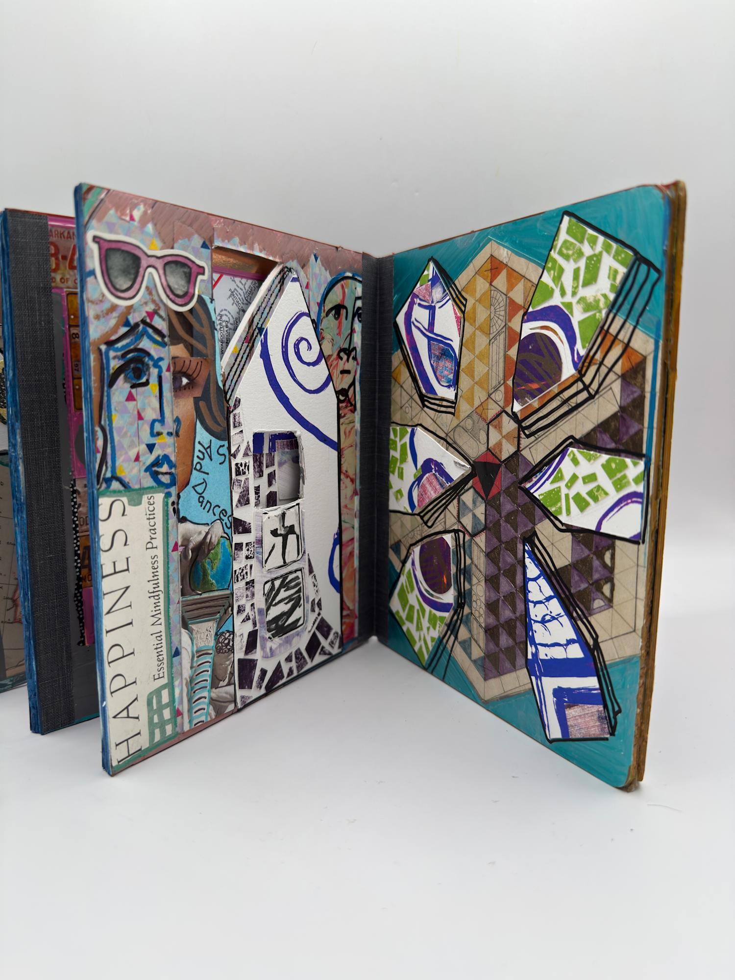 Accordion book with collage elements, prints, screen prints.