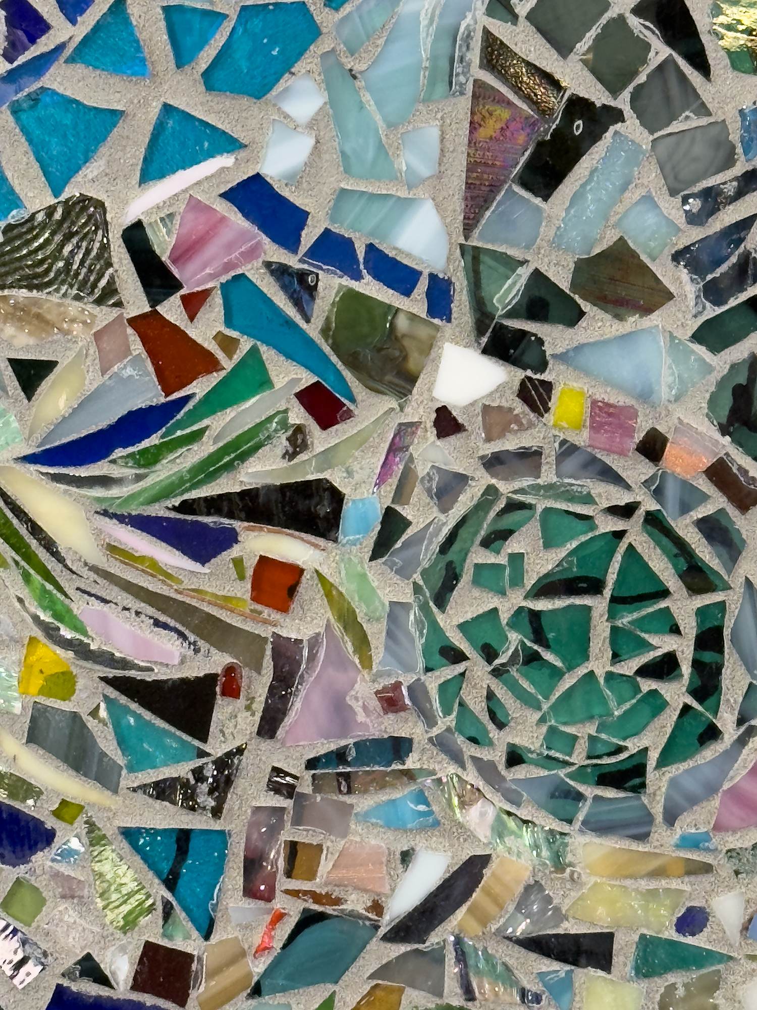 Copper plate etching under glass, mosaic of multi color glass and grout
