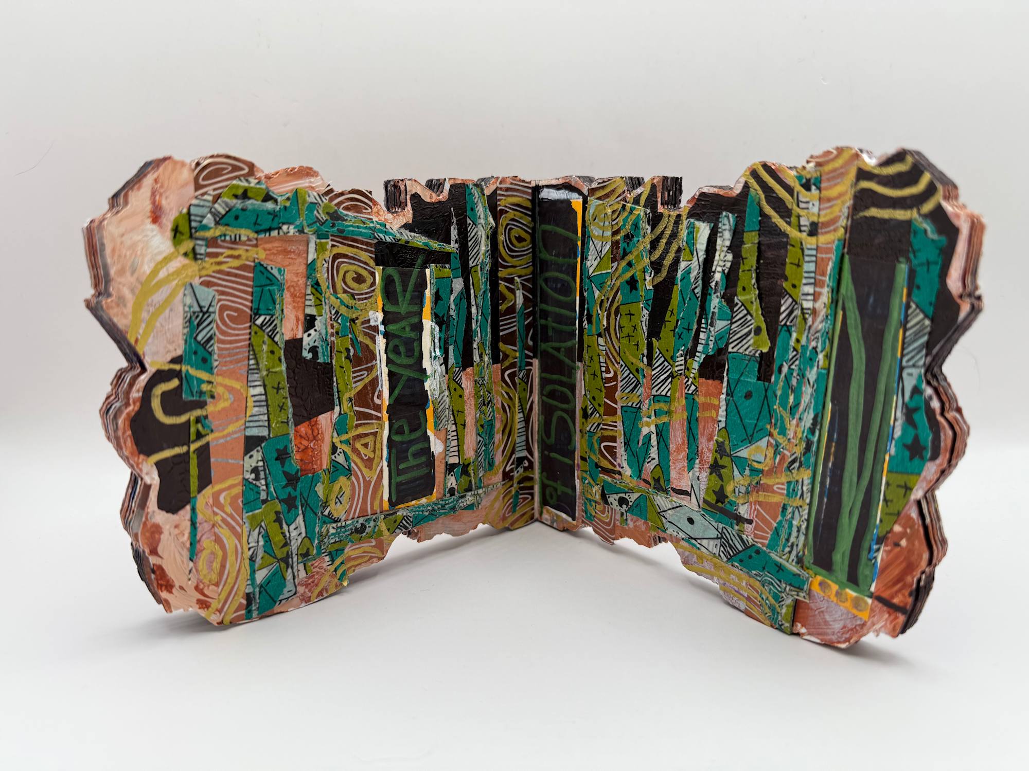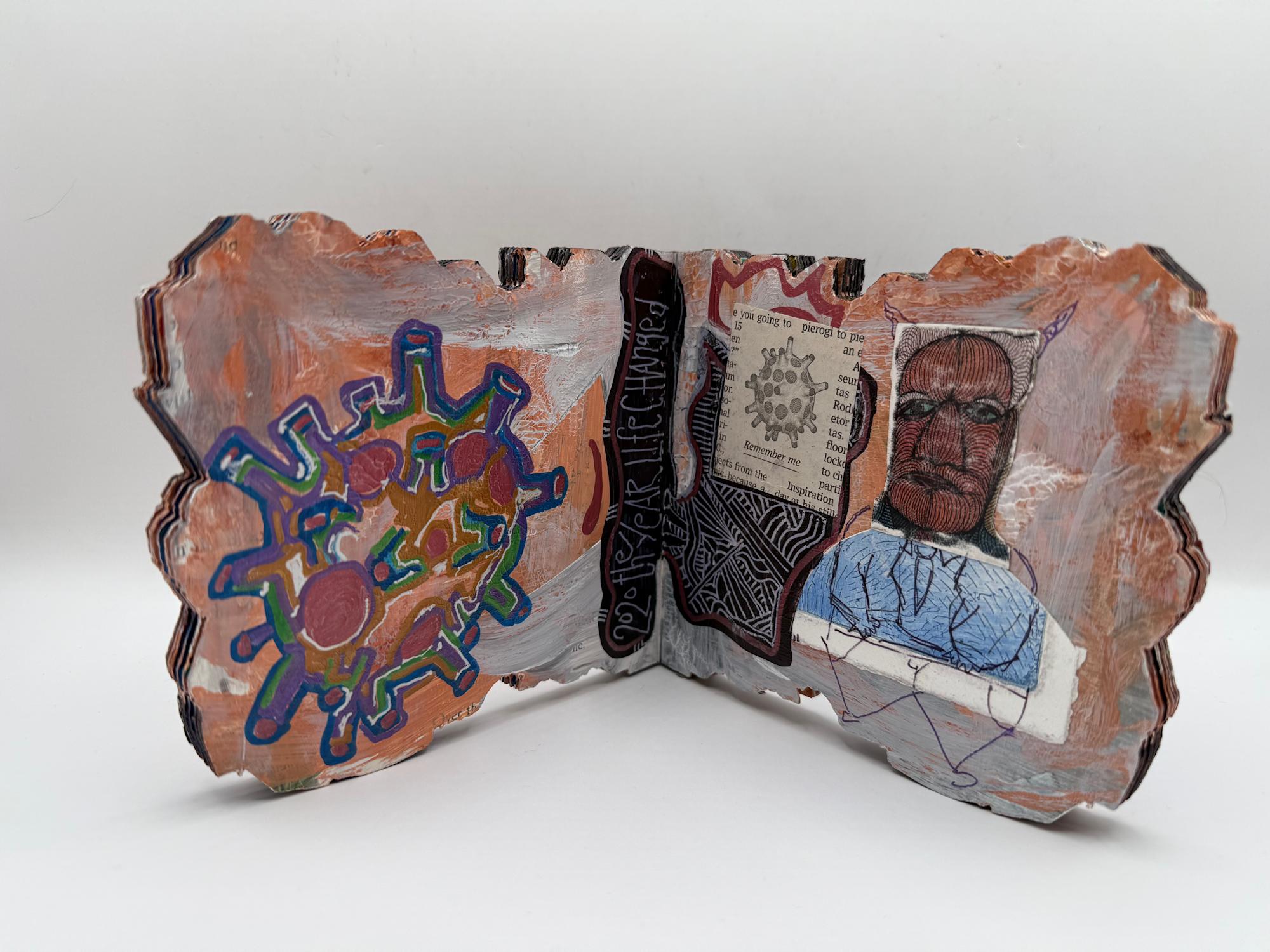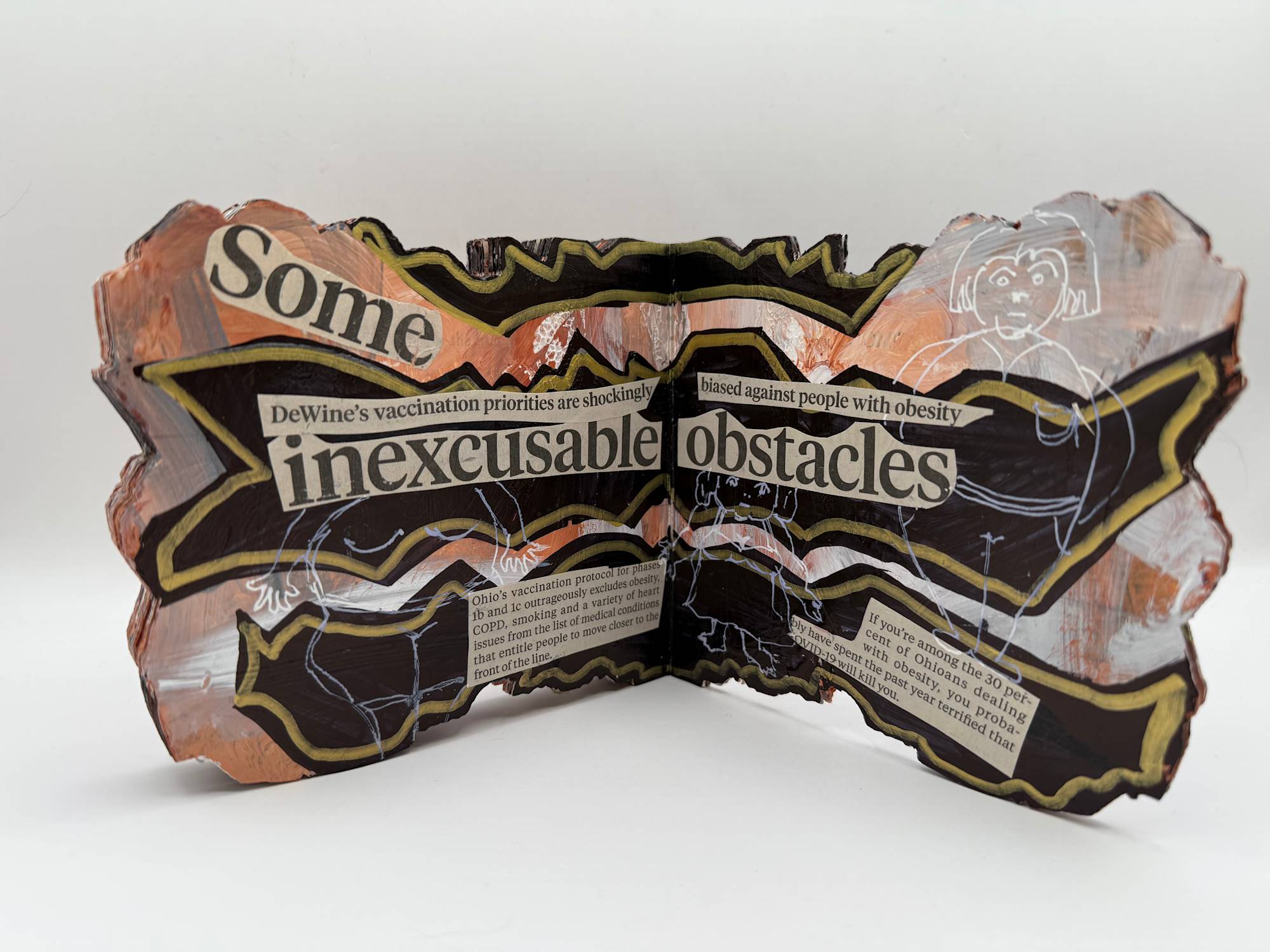 Altered book , base is a children's board book. Newspaper clippings from pandemic .