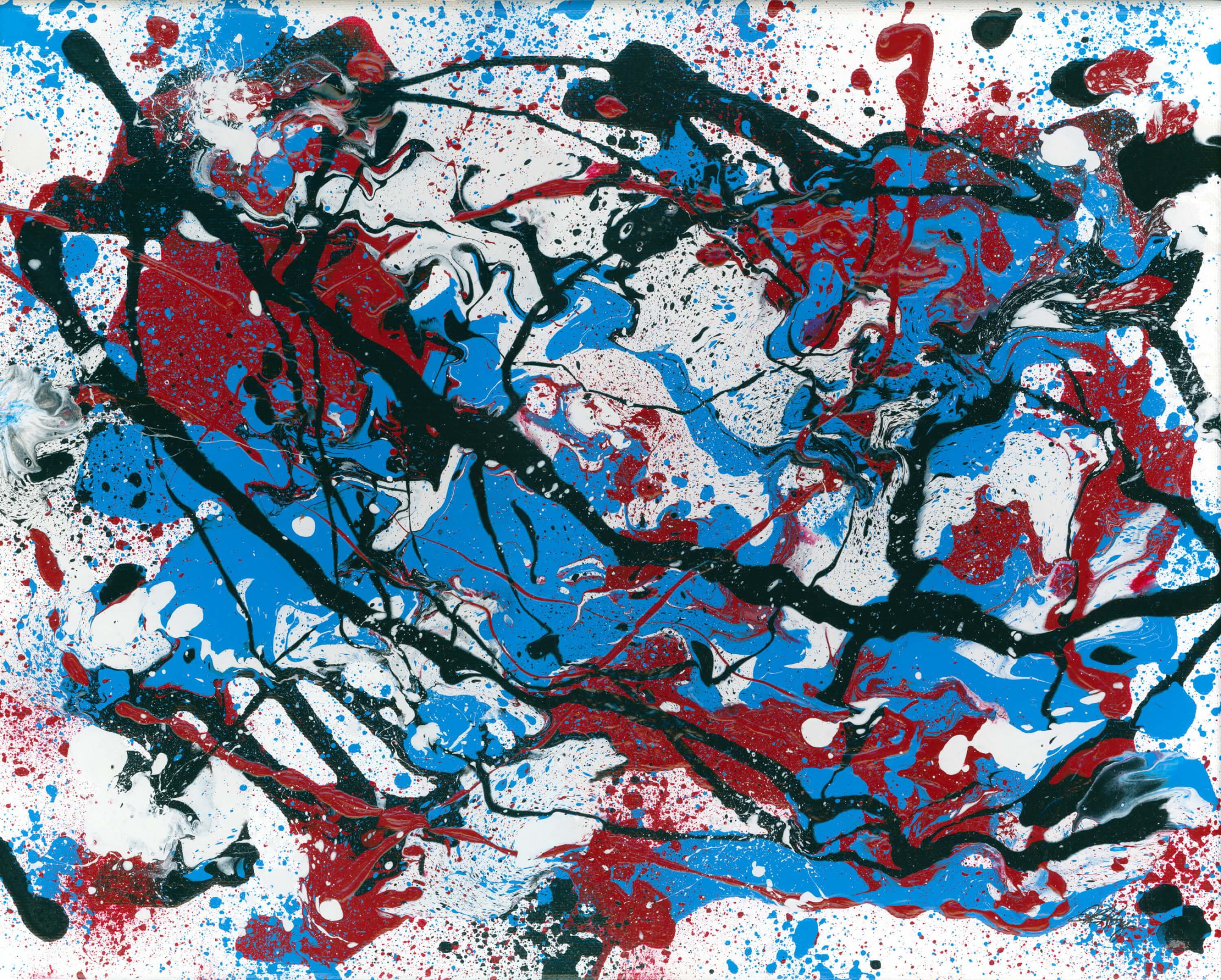 The inspiration for this artwork was a reflection in a small rippling pond while walking through the woods on a somewhat cloudy spring day. The red flowering blossoms seemed to be tightly holding onto the dark branches as the wind strongly blew through the nearby tree. I was mesmerized as I sat and watched the the intriguing reflections on the slowly dancing water. The reflection of the bright blue sky and the shades of white and grey clouds along with the image of the rustling tree and its red blossoms was a surreal vision to behold. With the reflected image constantly dancing and the shape of the reflections becoming so distorted at the discretion of the prevailing wind, it just lent itself to this abstract interpretation of those surreal few moments in time. I hope you enjoy viewing this piece as much as I enjoyed the original moment. Beauty and wonder surround us. Try to take some time to stop and observe it.