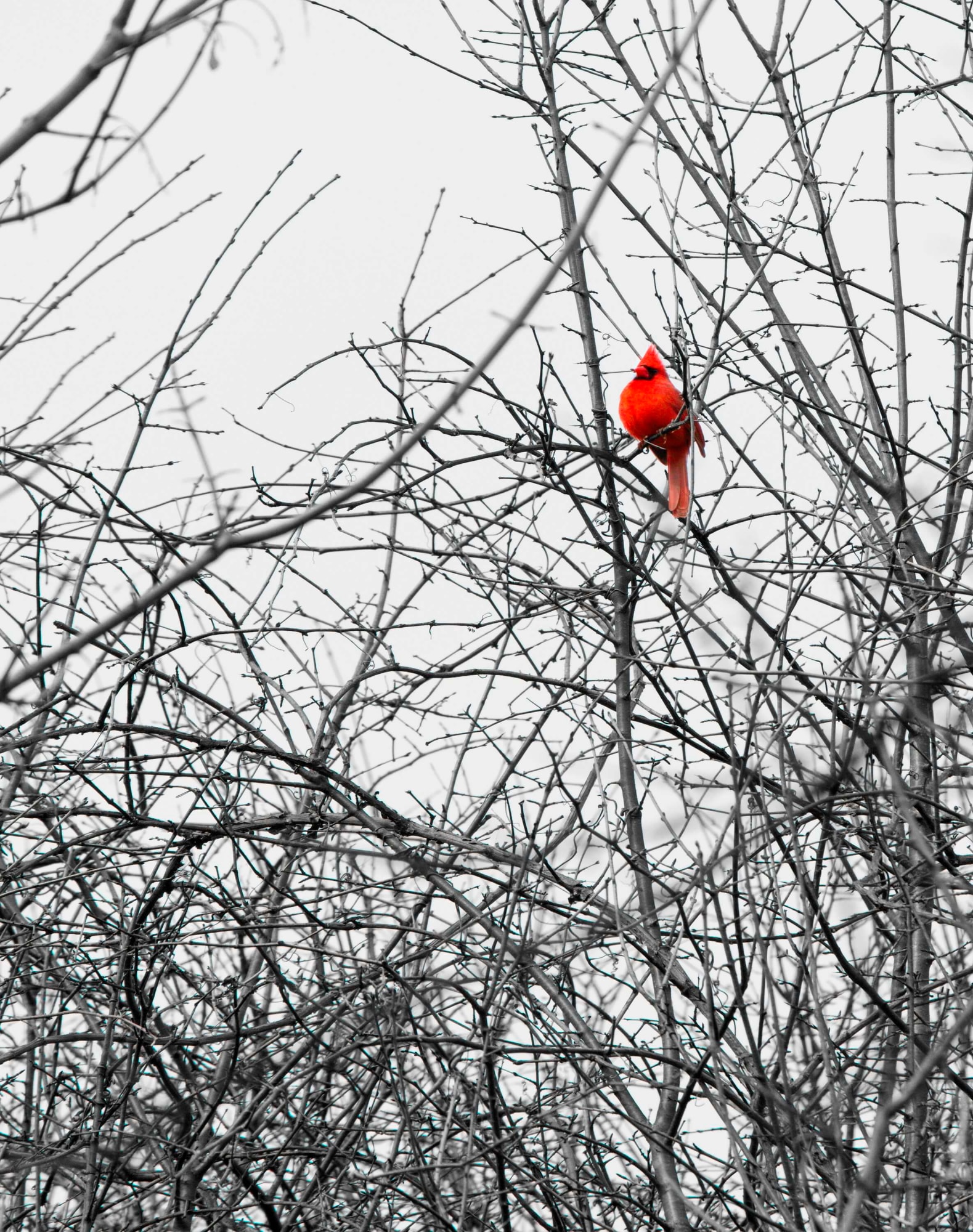 As you gaze at the artwork, you take in the complexity of the dark bare branches of the tree. They are silhouetted against a grey overcast sky, creating a dark tangled web. Your view is drawn to the presence of a small patch of bright red in the upper right portion of the composition. In a seemingly colorless picture is a beautiful bright red cardinal perched on the barren tangled tree limb looking back at you. This is a wonderful play on a single color to draw you into the scene. Peaceful and serene, it is a great piece to sit in front of and relax.