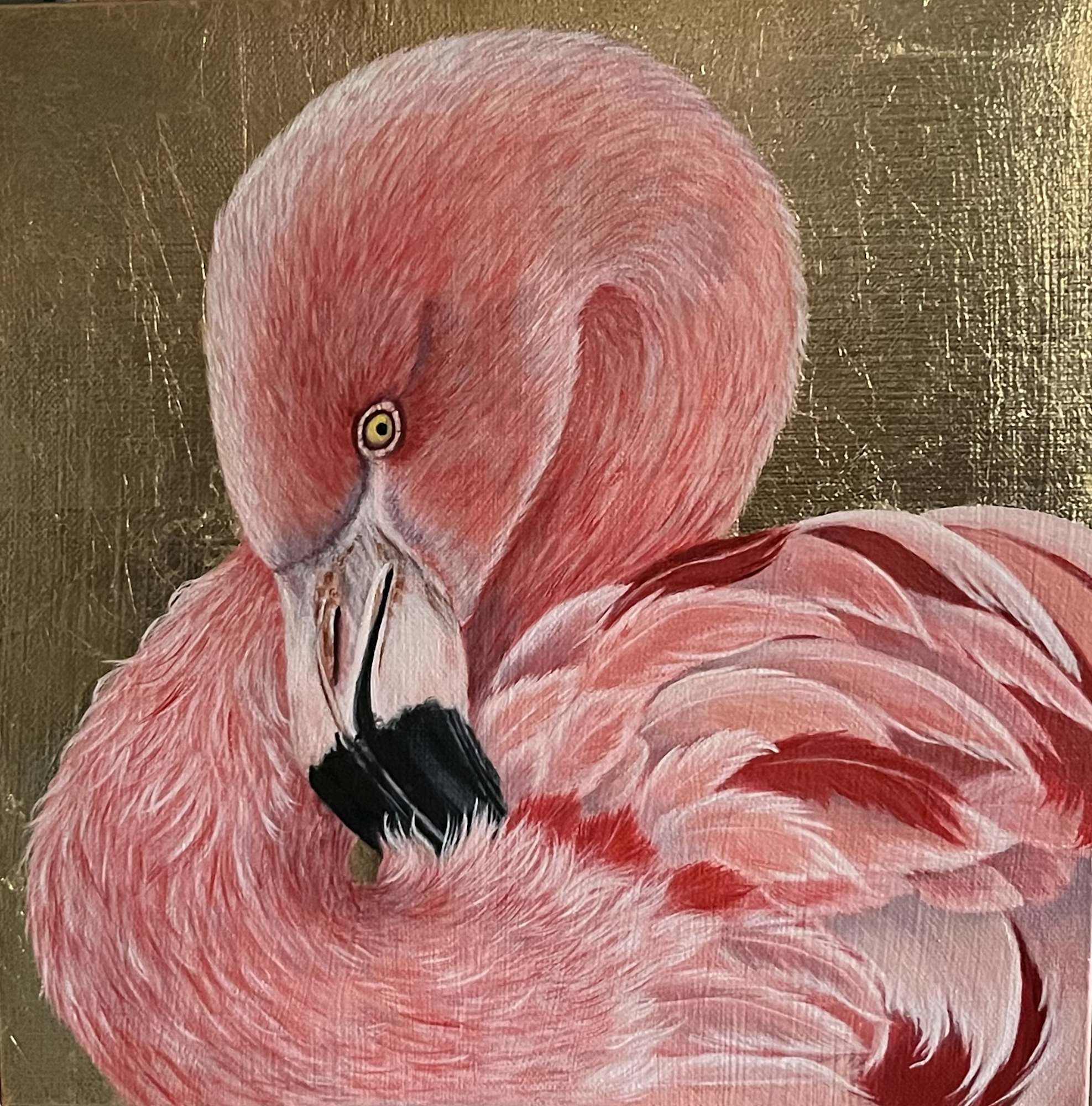A pink flamingo rests in a graceful curve, its warm plumage glowing against a luminous gold leaf backdrop. Fine detail in the head and beak contrasts with softer feather strokes, blending precision with painterly elegance in this intimate 12 x 12 wildlife portrait. Part of my ongoing wildlife portrait series in a 12x12 format.