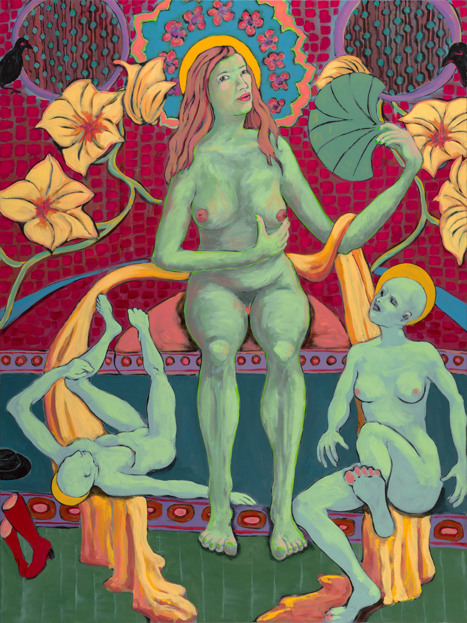 This piece is a visual interpretation of poems by Alexis Rhone Fancher about Angelica from Fancher's book "Triggered." The green-hued skin and the religious iconography, suggest a provocative artistic response to the themes presented in Fancher's feminist erotica.