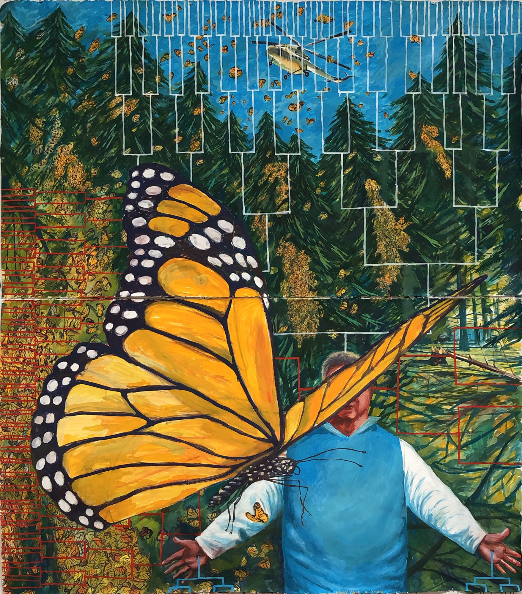 This composition and even its theme relates strongly to Giovanni Bellini’s “St. Francis in the Desert” or also known as the “Ecstasy of St Francis”. I’ve always loved it’s composition which, to me always seemed like it could be divided into four sections, with the figure in the lower right quadrant. My painting depicts Homero Gomez Gonzales a manager of a monarch butterfly reserve in Mexico, who was murdered early in 2020. I painted blue flow chart lines emanating from his stigmata and I had a feeling about the Bellini painting and decided to find it in a book or online and look at it. That’s when I read that the painting depicts St. Francis receiving the stigmata. Not sure if I knew that already, but it must have been in my brain somewhere and the image, I now realize holds well as a contemporary reboot of Bellini’s masterpiece...not that my painterly skill is any match, but just giving sway to his composition and depicting a contemporary figure who, like St Francis, connected with the natural world...and I hate to be too sappy in making a religious reference, but was martyred in turn. Christianity is not my thing, but it is a part of my psyche and personal history. I do not know why I placed a helicopter hovering above...in reading about Bellini’s version it says that “when Francis is receiving the sigmata, usually an angel, a seraph or a crucifix emitting rays is depicted as well.” but Bellini chose not to insert such a figure, rather it seems that there is just sunlight bathing St Francis and giving him his stigmata. My version substitutes flight technology for what I’m now accepting as an angel (from hell?) handing out his stigmata.