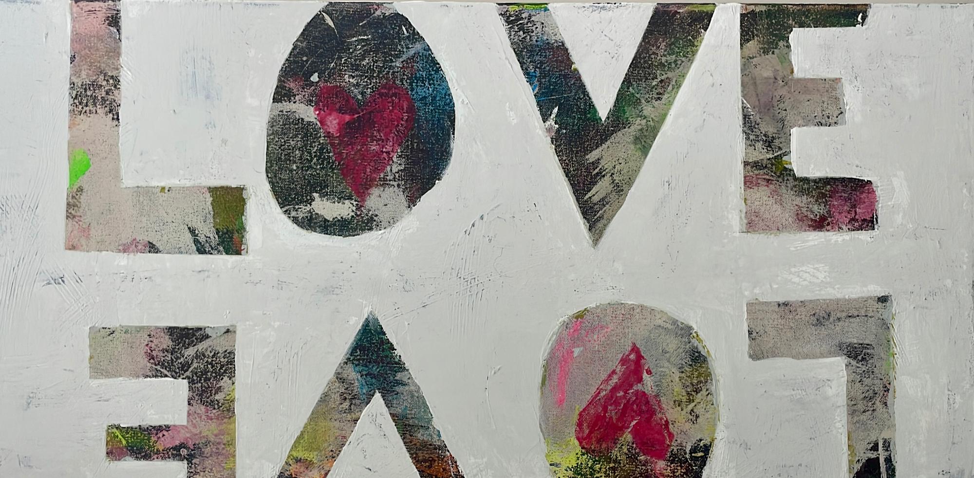 A background with the textures of life...Love cut into the white showing the underneath colors of a chaotic wonderful life. Small pink hearts in the "O" to highlight the love of life and living.