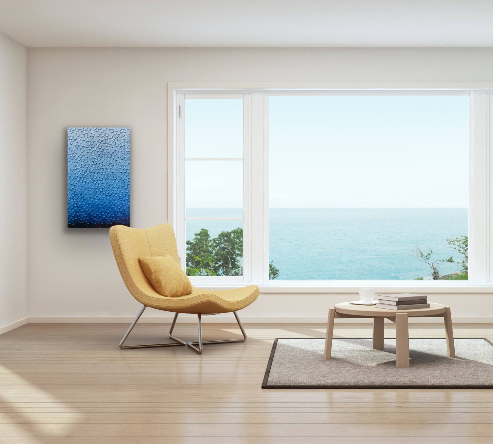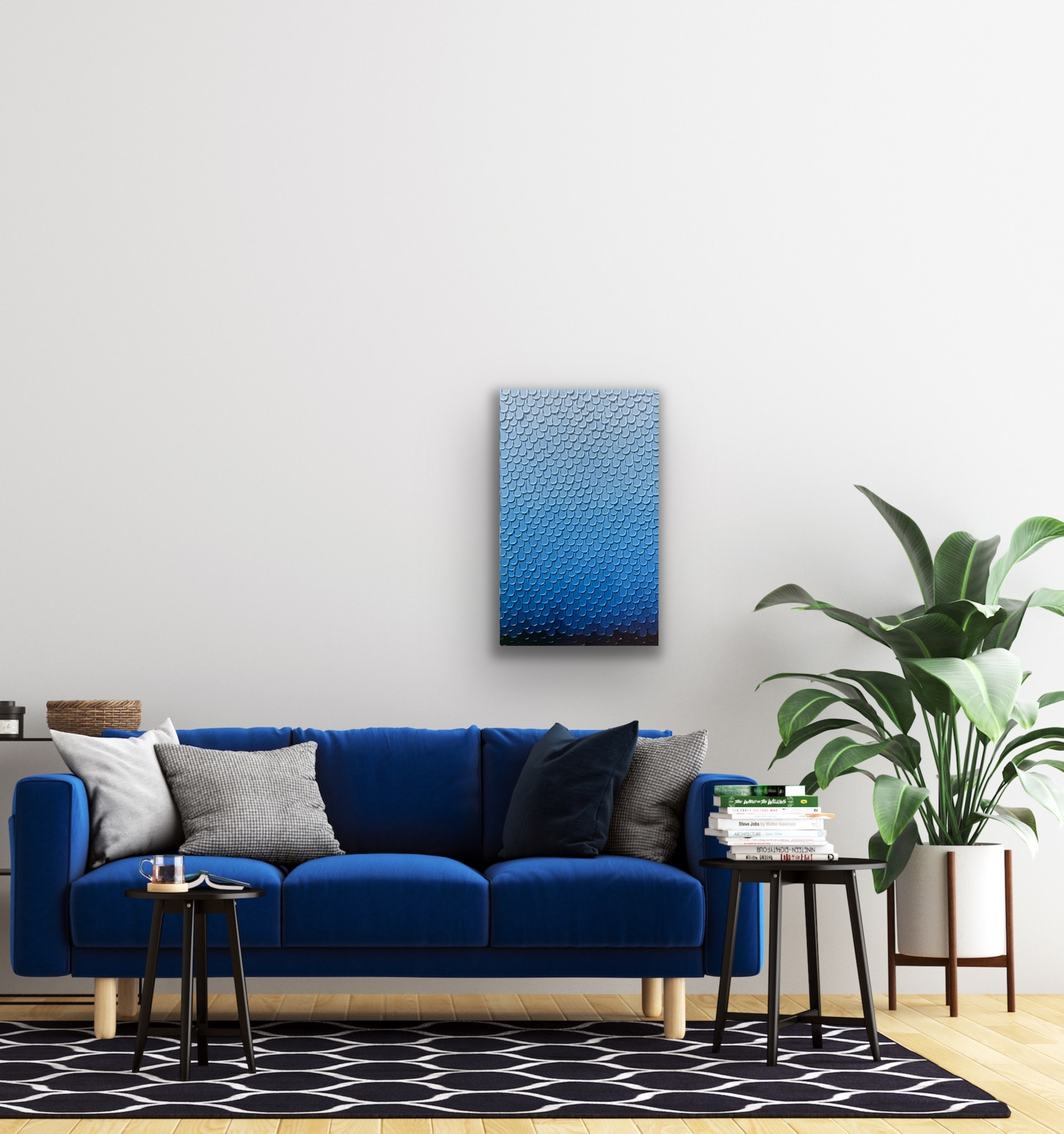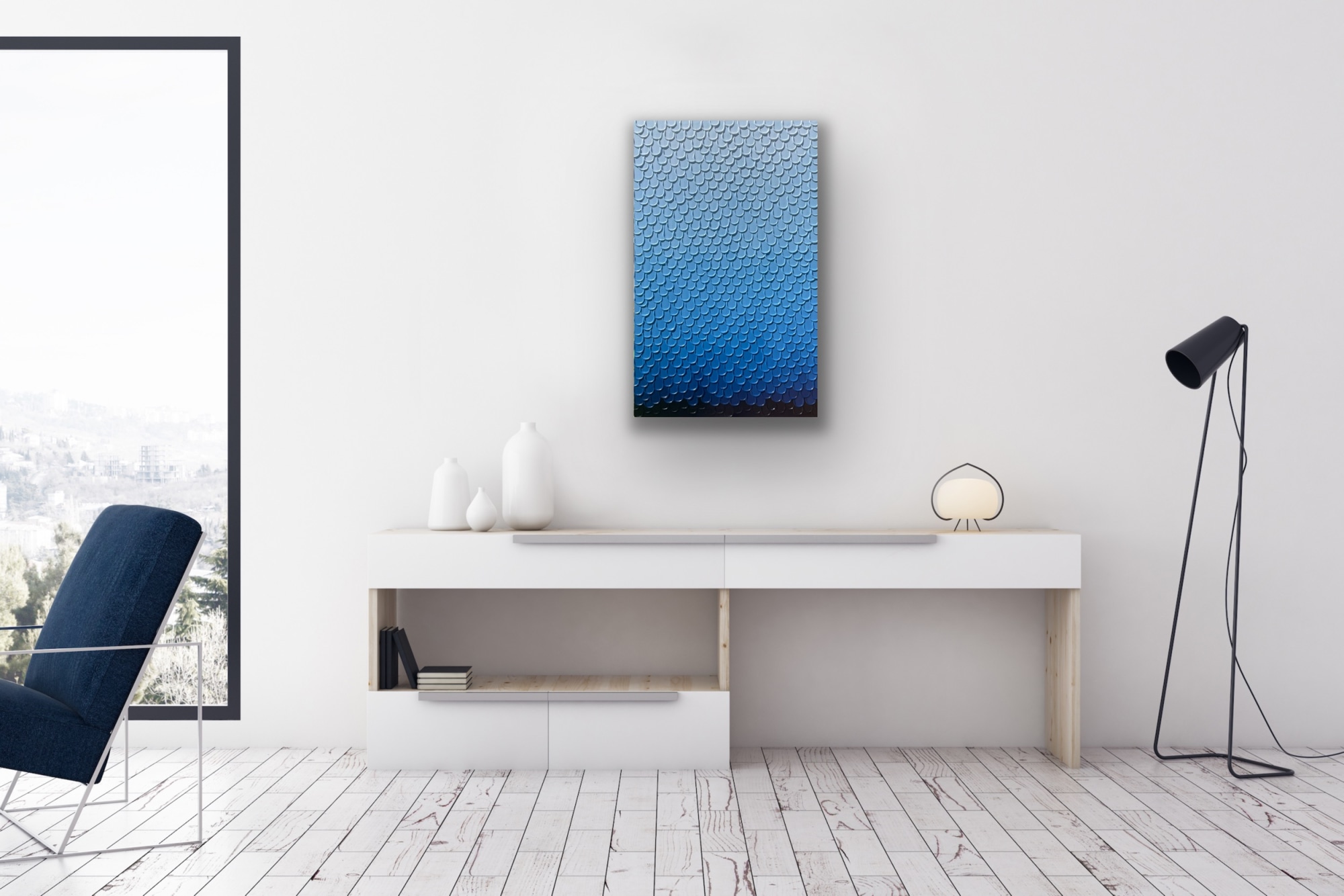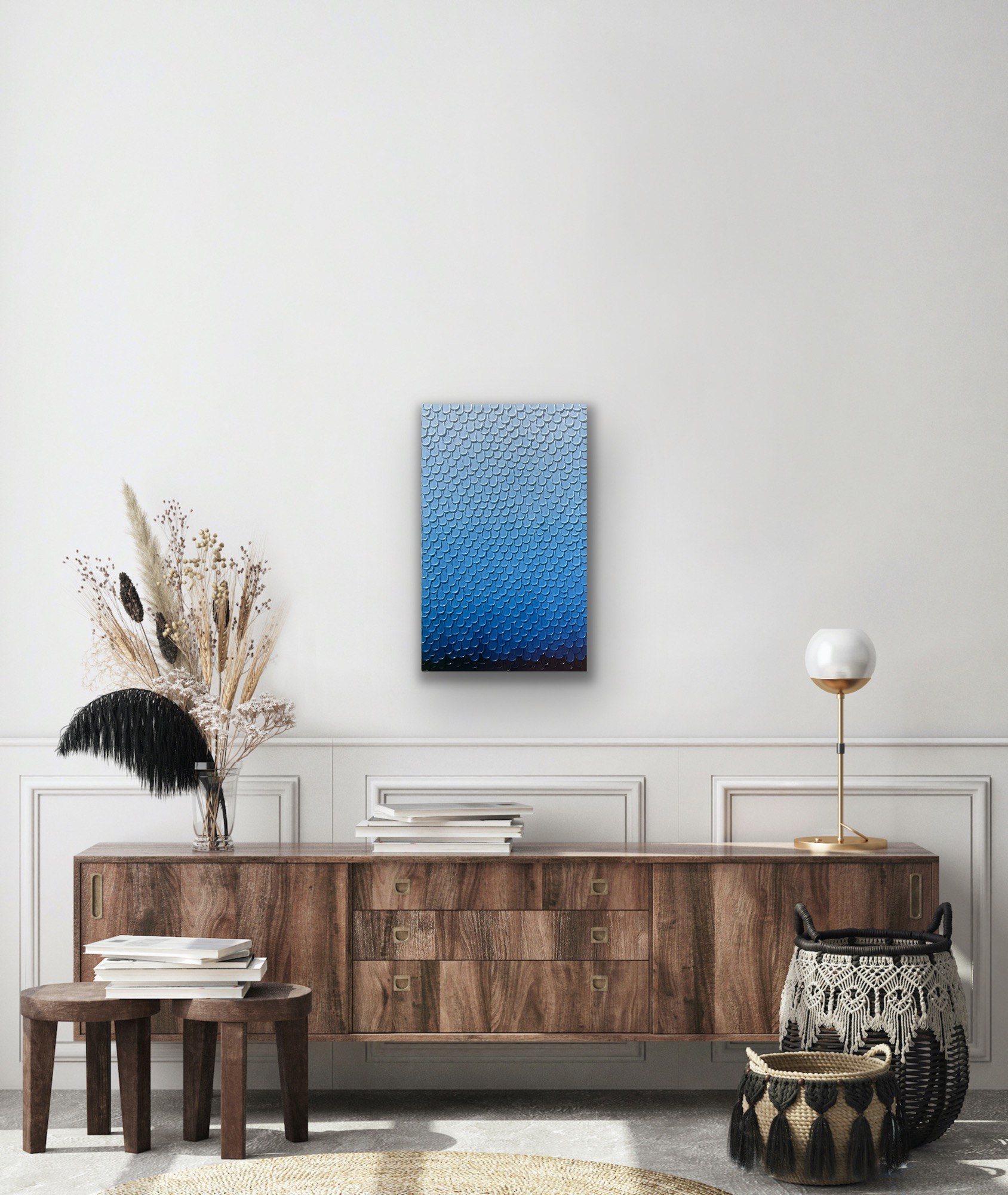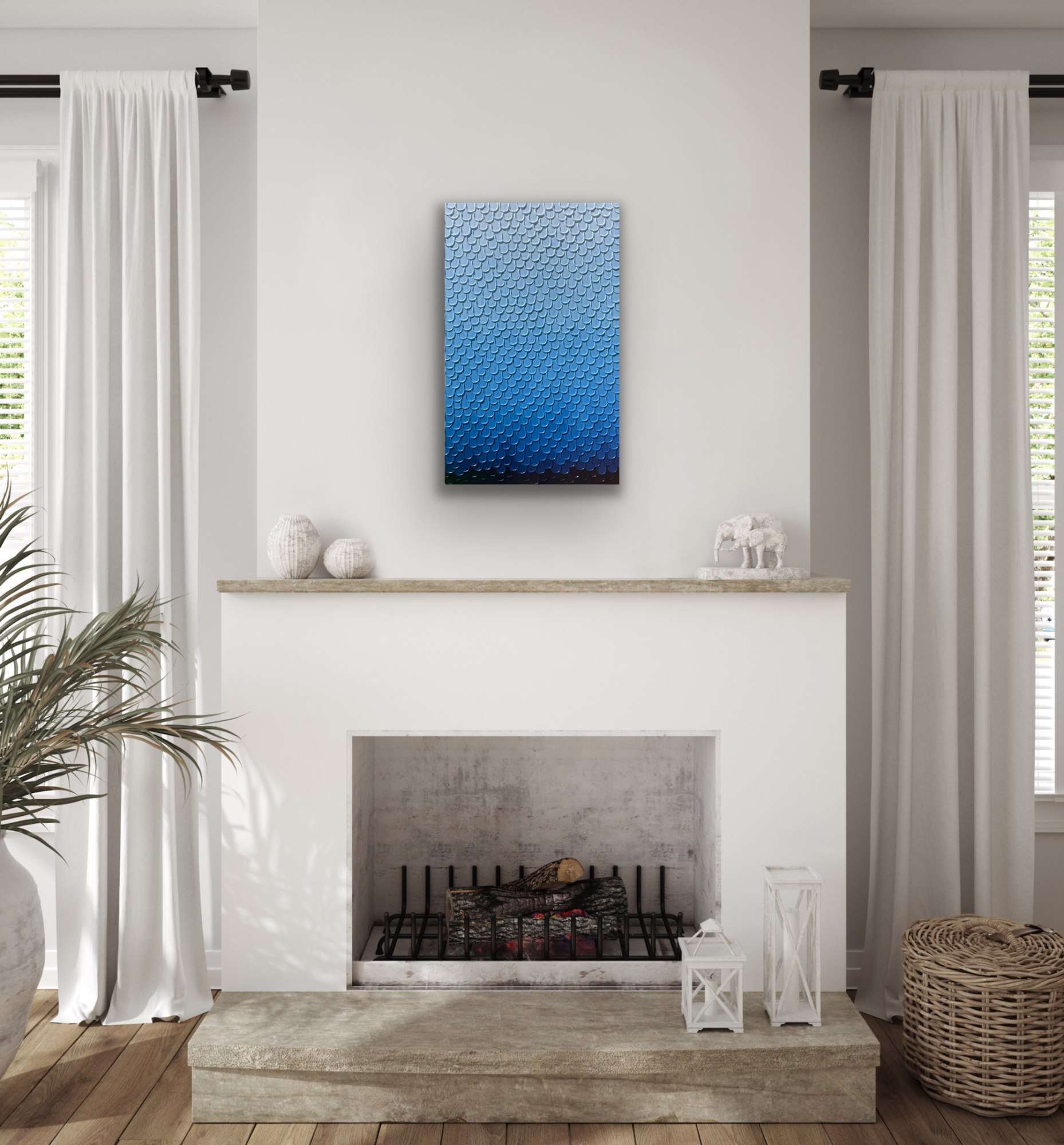 Created using a palette knife and thick acrylic paint mixed with impasto to create a textured surface which adapts depending on light and shadow within the room.